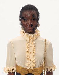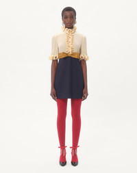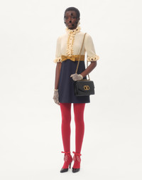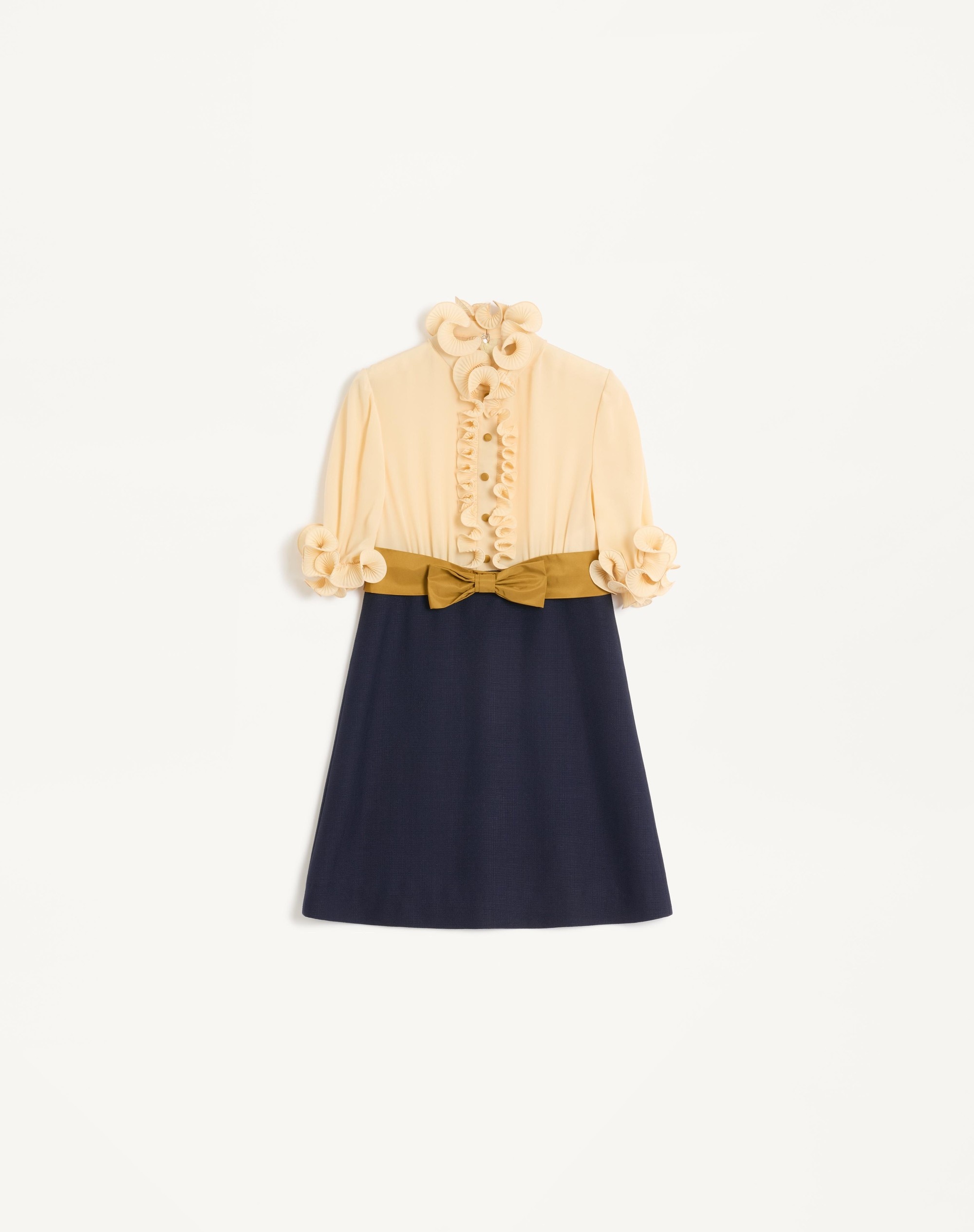 Crepe de Chine and Viscose short dress detailed with ruffles and Faille bow - Button detail on the top - Rear zipper closure - Viscose (100% Viscose) - Habotai lining ( 100% Silk) - Length: 87 cm / 34.2 in. from the shoulders in an Italian size 40 EN - The model is 176 cm / 5'9" tall and wears an Italian size 40 - Made in Italy The look of the model is completed by a Valentino Garavani Vain Bag and Valentino Garavani Foliefoliage Shoes. Product code: 6B0VADJ698T_DSV