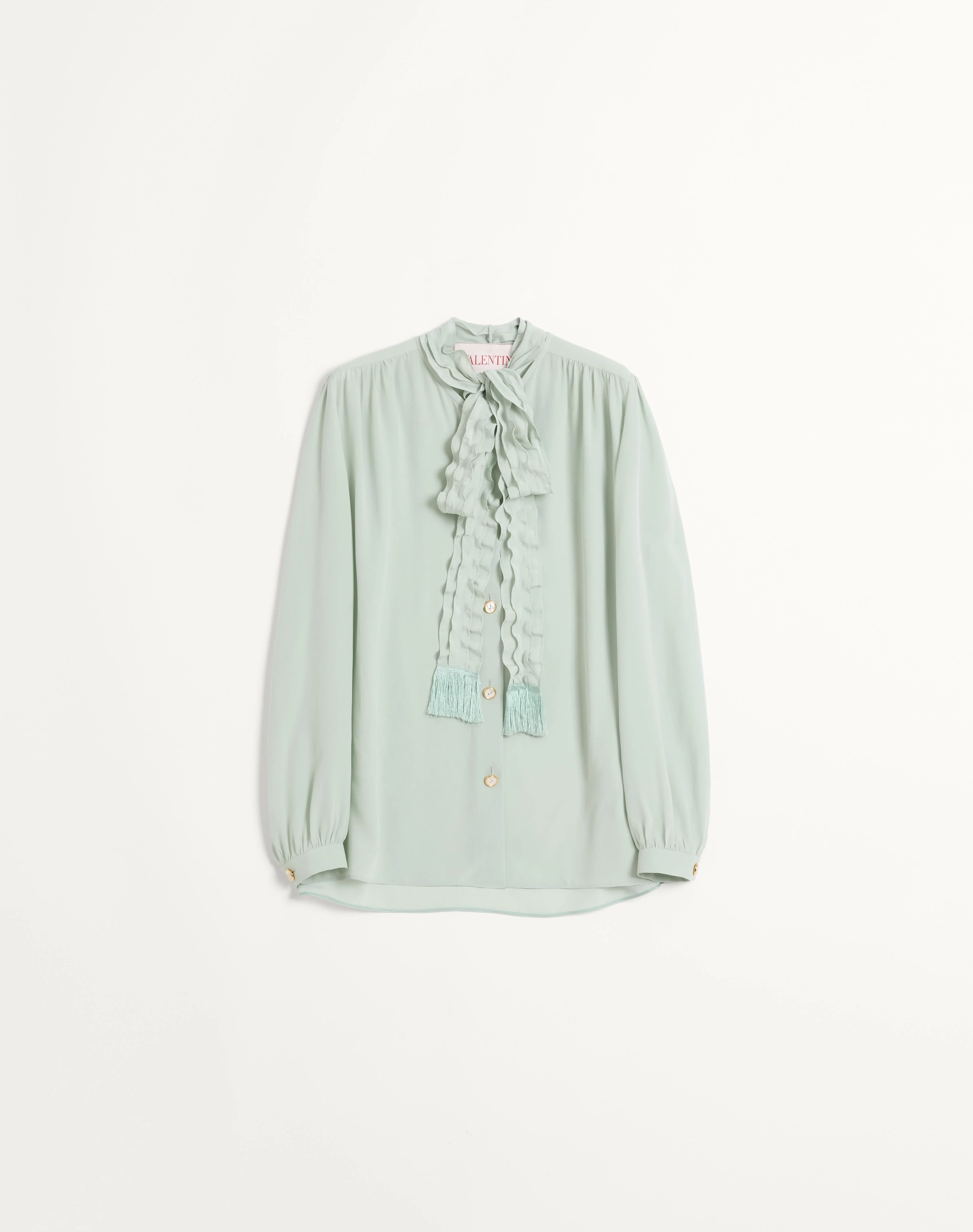 Crepe De Chine long-sleeved shirt - Bow detail with ruffles at the neck - Front button fastening - Crepe de Chine (100% Silk) - Unlined - Length: 70 cm / 27.6 in. from the shoulders in an Italian size 40 - Sleeve length: 83 cm / 32.7 in. from the center back in an Italian size 40 - The model is 176 cm / 5'9" tall and wears an Italian size 40 - Made in Italy The look of the model is completed by a Valentino Garavani Viva Superstar Bag and Valentino Garavani Bowow Shoes. Product code: 6B3AB77590F_R5F
