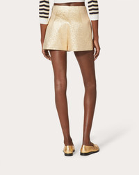 Crispy Gold VLogo Chain Shorts - VLogo Chain detail on waist - Concealed side zipper and hook and eye fastening - Crispy Gold (39% Polyester, 33% Silk, 28% Metallic Fiber) - Habotai lining (63% Viscose, 37% Silk) - Length from waist 34 cm / 13.3 in. in Italian size 40 - Leg opening 69 cm / 27.1 in. in Italian size 40 - Inseam 6.3 cm /2.4 in. in Italian size 40 - The model is 176 cm / 5' 9" tall and wears an Italian size 40 - Made in Italy Product Code BRF23679Y_G70