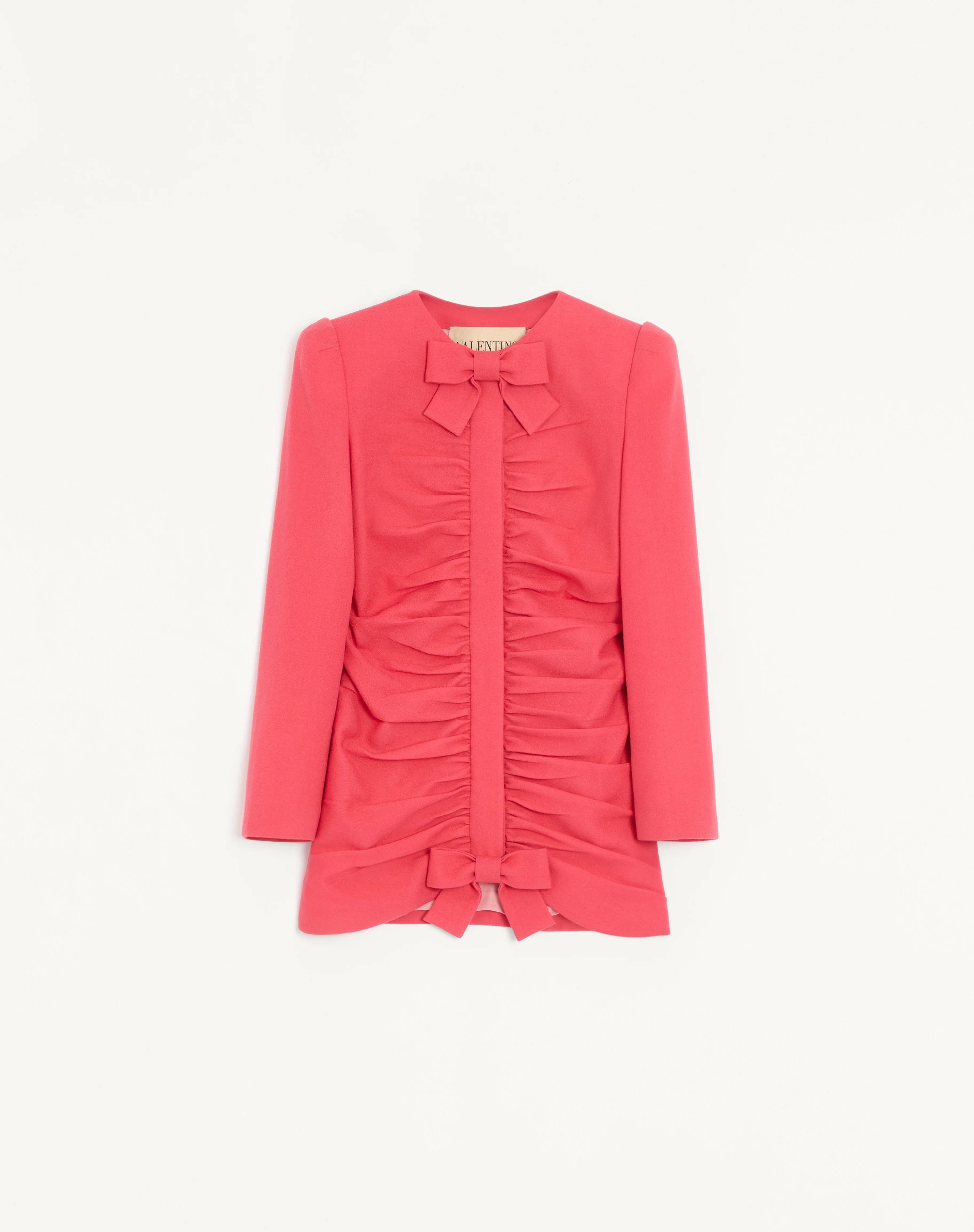 Jacket in crispy light wool with front ruching and matching bows - Padded shoulders - Front zipper closure with snap buttons - Crispy Light Wool (100% Virgin Wool) - Flower, Stripes, and VLogo lining (74% Acetate, 26% Silk) - Length: 76 cm / 29.9 in. from the shoulders in an Italian size 40 - The model is 176 cm / 5'9" tall and wears an Italian size 40 - Made in Italy The look of the model is completed by Valentino Garavani Shoes. Product code: 8B0CE5R5A6F_FE7