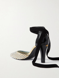 Valentino Garavani's pumps debuted on the label's Spring '25 runway, where they were styled with a variety of retro-inspired looks. They have crystal-embellished gold mesh vamps contrasted by 85mm glossy patent-leather heels. The suede ties are stippled with studs at each end - knot them so the pretty detailing is in full focus.