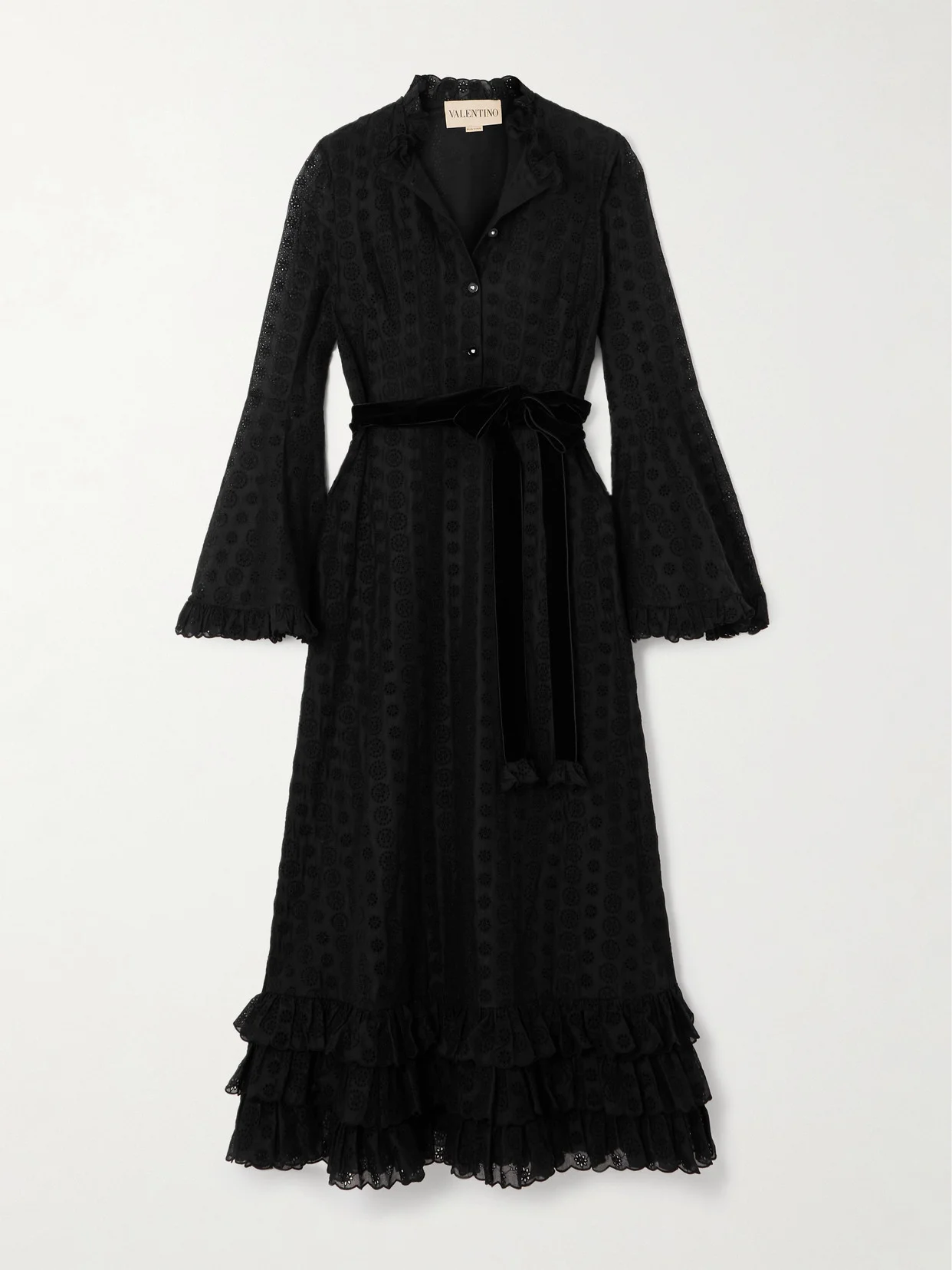 Belted Tiered Velvet-trimmed Broderie Anglaise Cotton Midi Dress