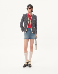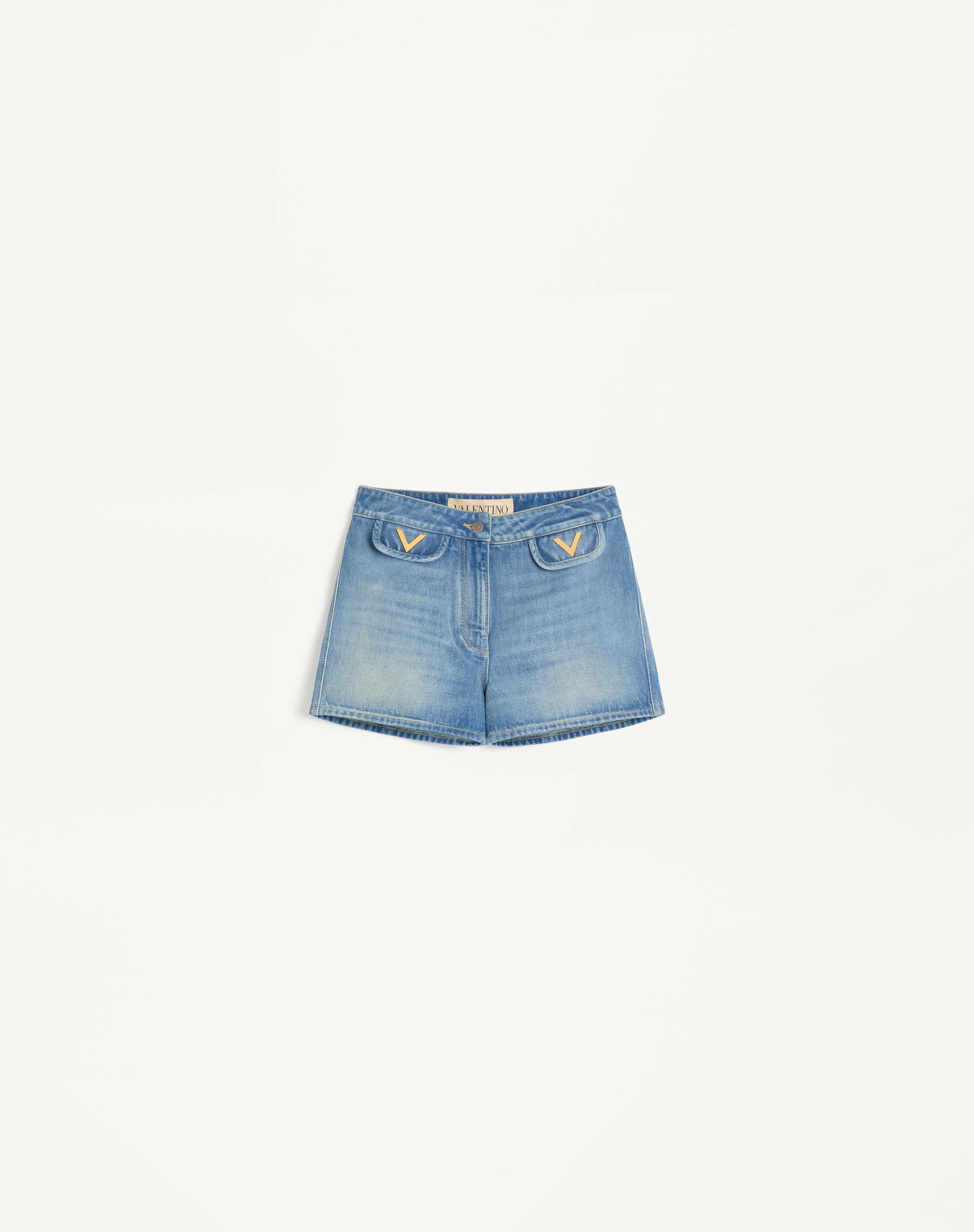 Denim Shorts with V Gold - Front button and zipper closure - Medium Blue Denim (100% Cotton) - Length: 28.5 cm / 11.2 in. from the waist in an Italian size 40 - The model is 176 cm / 5'9" tall and wears an Italian size 40 - Made in Italy The look of the model is completed by a Valentino Garavani Nellcote Bag and Valentino Garavani Fawcette Shoes. Product code: 7B3DD20R9HC_558