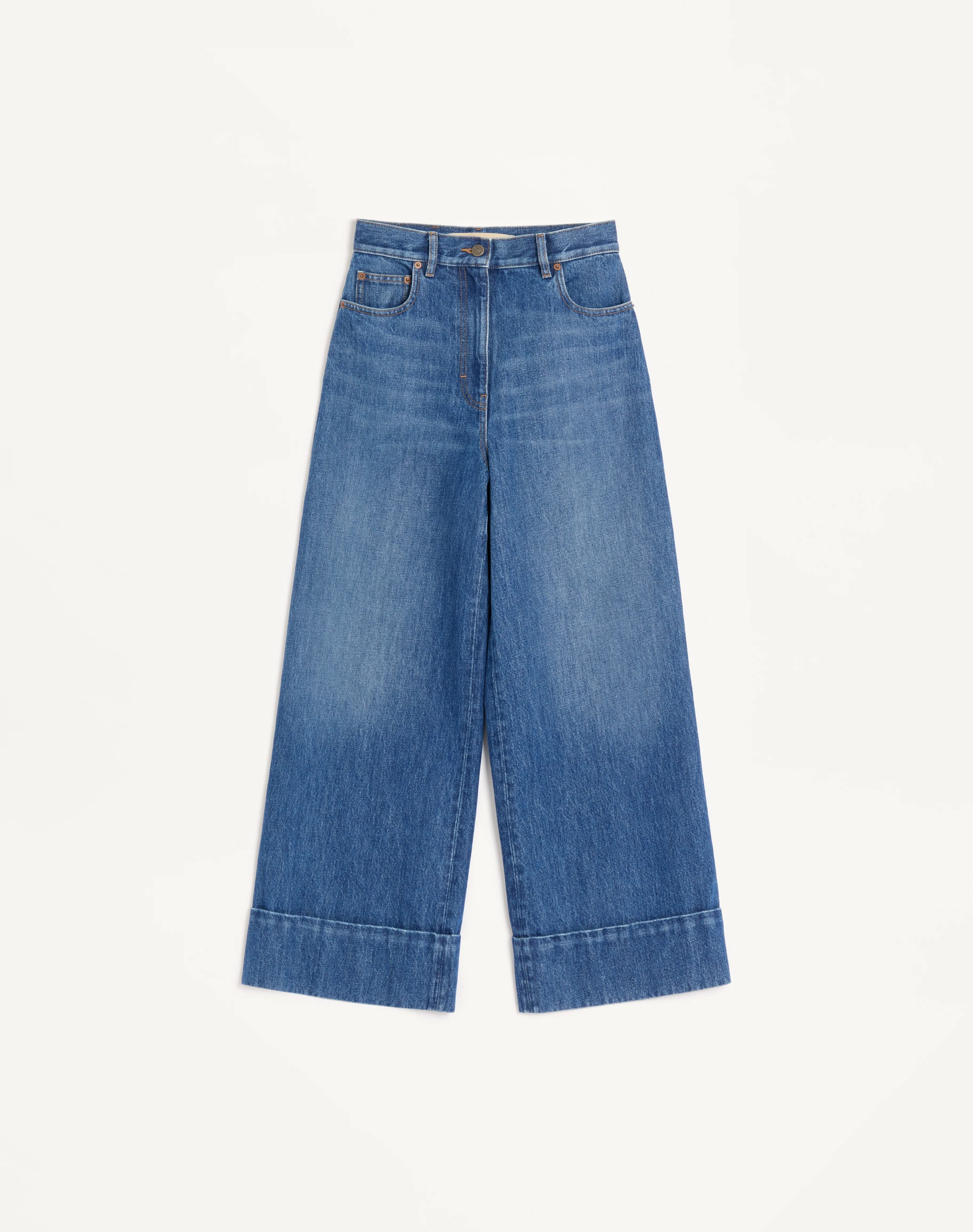 Denim Pants with V Gold - Cuffed ankles - Front button and zipper closure - Medium Blue Denim (100% Cotton) - Length: 97.5 cm / 38.4 in. from the waist in an Italian size 40 - The model is 176 cm / 5'9" tall and wears an Italian size 40 - Made in Italy The look of the model is completed by a Valentino Garavani Viva Superstar Bag and Valentino Garavani Hotty Shoes. Product code: 8B3DD29K9Y8_558