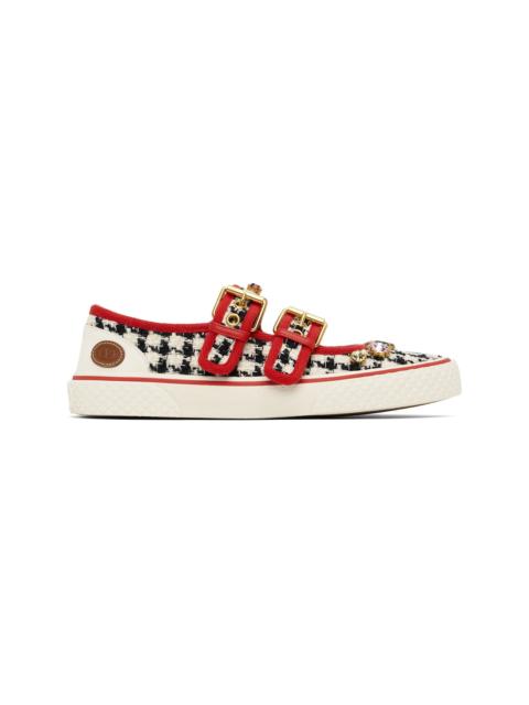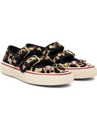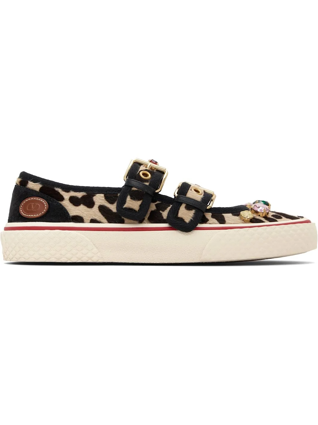 Low-top hair-on calfskin Mary Jane-style sneakers. · Leopard pattern printed throughout · Crystal accents at vamp and straps · Pin-buckle straps at vamp · Canvas trim at straps and collar · Leather logo patch at suede heel counter · Buffed leather lining · Textured and crepe rubber midsole · Crepe rubber sole Supplier color: Naturale/Testa Upper: calfskin. Sole: rubber. Made in Spain 252807F128003