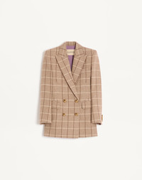 Double-breasted wool blazer with windowpane check pattern - Shoulder pads - Front closure with VLogo buttons - Windowpane check (100% Virgin Wool) - Crepe De Chine Diagonal Stripe VLogo Lining (75% Acetate, 25% Silk) - Length: 75 cm / 29.5 in. from the shoulders in an Italian size 40 - The model is 176 cm / 5'9" tall and wears an Italian size 40 - Made in Italy The look of the model is completed by Valentino Garavani Panthea Shoes. Product code: 7B0CE4V29R3_CCE