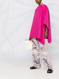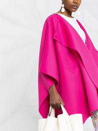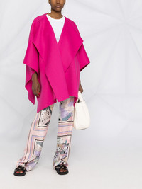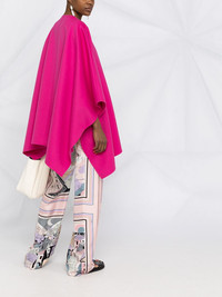 draped button cape Cosy and hands-free. Don't let a winter coat hold you back. make sure you're ready for the day with help from this pink wool and cashmere cape from Valentino Garavani. Fastened with a single button, it's the perfect pick. Highlights - Valentino ready to wear - Pink - Wool/cashmere - Front button fastening - Batwing sleeves - Asymmetric hem Made in Italy Composition Virgin Wool 95%, Cashmere 5% SIZE & FIT Model measurements Height 5 ft 11 in(1.8 m) Bust/Chest 31.49 in(80 cm) Hips 36.61 in(93 cm) Waist 24.4 in(62 cm)