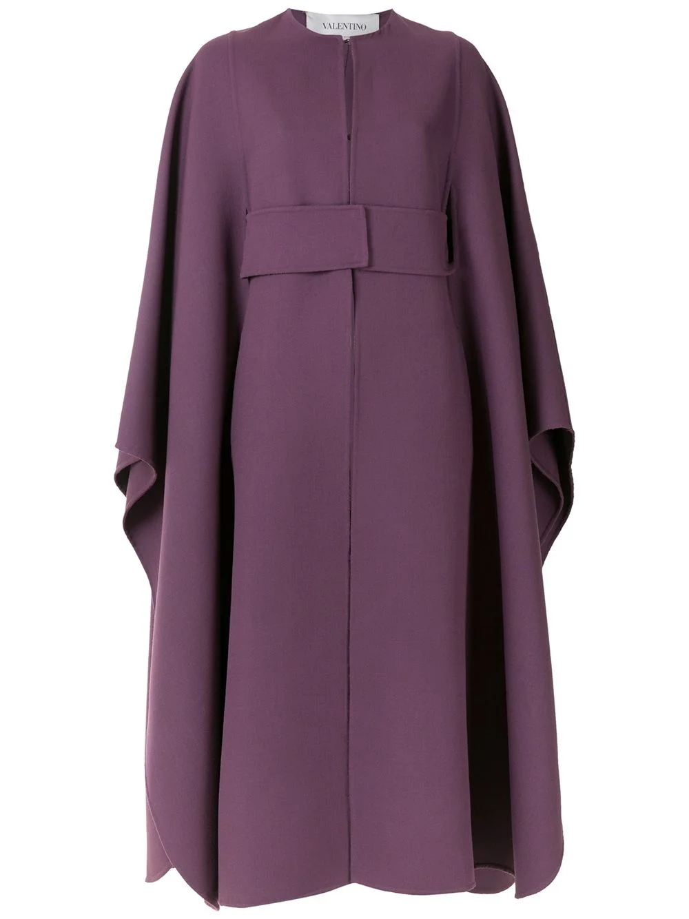 draped mid-length cape Make every entrance dramatic. And then make every exit dramatic. With this mid-length Valentino cape you can do everything. Featuring a round neck, a concealed front fastening, a draped design, a mid-length and a front strap fastening. Made in Italy Composition Virgin Wool 100% SIZE & FIT Model measurements Height 5 ft 10 in(1.77 m) Bust/Chest 32.28 in(82 cm) Hips 36.61 in(93 cm) Waist 25.19 in(64 cm) Measurement LENGTH 51.18 in(130 cm) SLEEVE LENGTH 24.4 in(62 cm) FittingInformation This piece fits true to size. We recommend you get your regular size Cut for a loose fit. Comes with an adjustable belt for a flexible fit at the waist Made with a mid-weight fabric