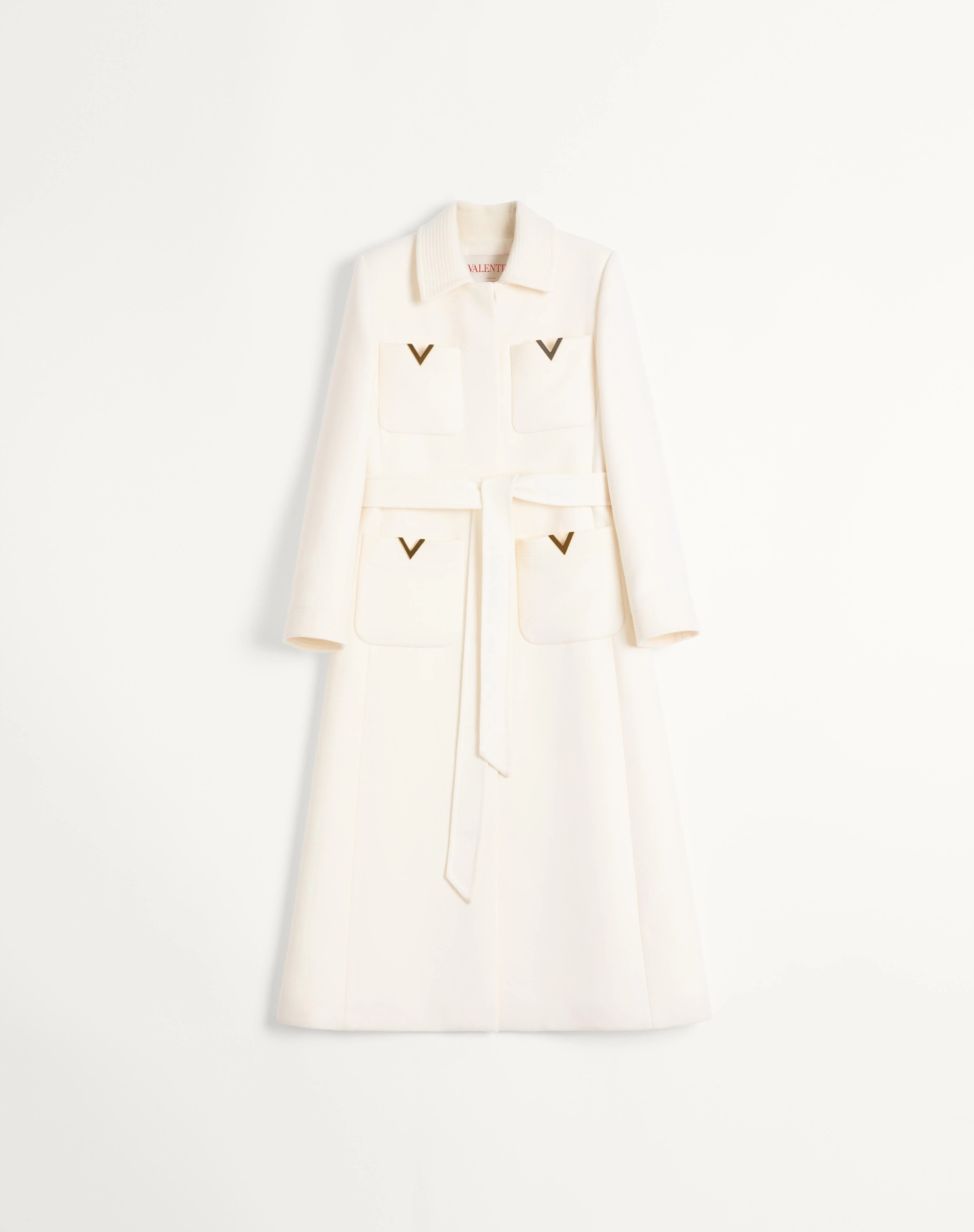 Drill Double coat - V Gold detail on pockets - Front closure with concealed buttons - Waist belt Drill Double (99% Virgin Wool, 1% Silk) - Viscose lining (100% Viscose) - Length: 120 cm / 47.2 in. from the shoulders in an Italian size 40 - Sleeve length: 80 cm / 31.5 in. from the center back in an Italian size 40 - The model is 176 cm / 5'9" tall and wears an Italian size 40 - Made in Italy The look of the model is completed by a Valentino Garavani Vain Bag and Valentino Garavani Bowow Shoes. Product code: 6B3CA6F85KJ_A03