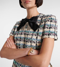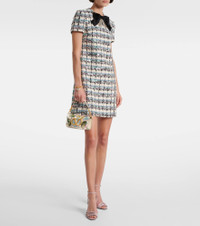 This tweed minidress from Valentino features an all-over check pattern and comes with a bow detail at the neck. Sequins and crystal embellishments accent the piece. Product Details - Material: 38% cotton, 28% wool, 14% viscose, 8% polyamide, 8% polyester, 2% acrylic, 2% mohair - Care instructions: dry clean - Made in Italy - Designer color name: Avorio/Multicolor/Silver - Item color: white, blue, black - Lining: 74% acetate, 26% silk - Embroidery: 100% polyester - Trim: 39% metallic fibres, 35% polyamide, 26% other fibres - Insert: 100% silk - Hardware color: silver - Closure: zip and hook fastening - Fully lined - Includes: garment bag - Item number: P01060204 Size & Fit - True to size - Designed for a loose fit - Non-stretchy fabric - The model seen in the picture is 178cm-5'10" and wearing a size IT 40