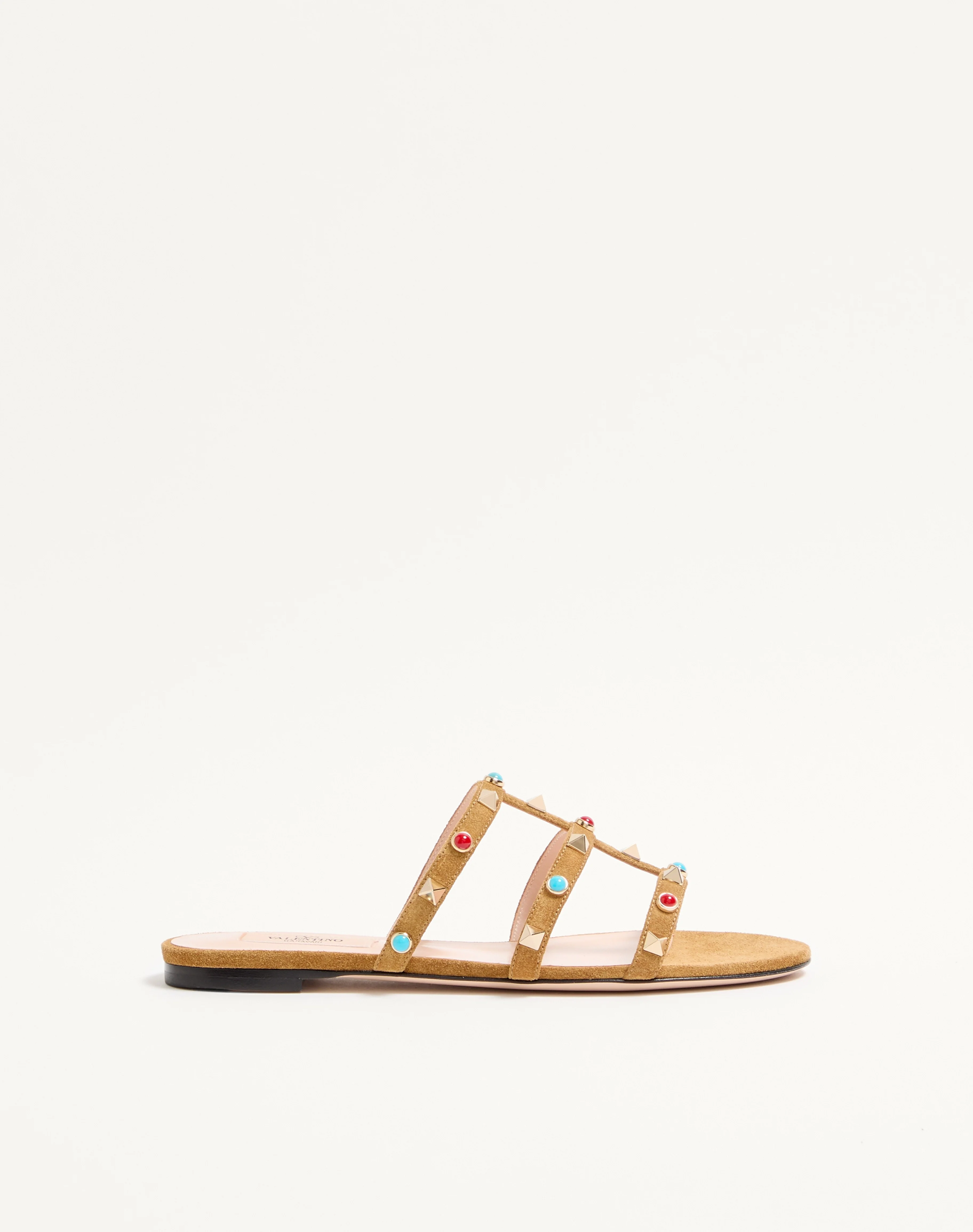 ROCKSTUD SLIDE SANDAL IN SPLIT LEATHER WITH CABOCHON STONES