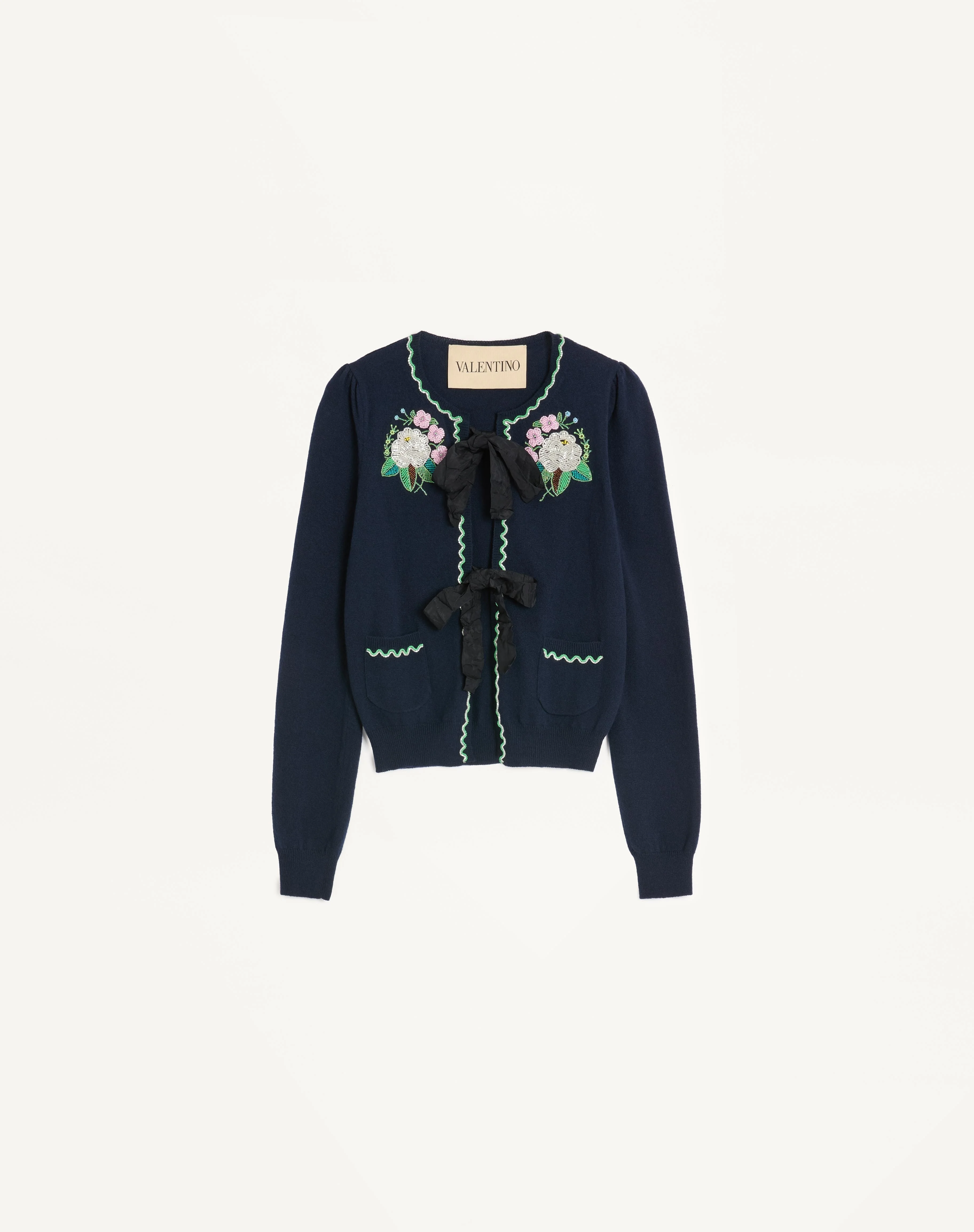 Embroidered Wool Cardigan - Front Gros Grain bow fastening - Wool (100% Virgin Wool) - Length: 52cm / 20.5 in. from the shoulders in an Italian size S - The model is 176 cm / 5'9" tall and wears an Italian size S - Made in Italy The look of the model is completed by a Valentino Garavani Bag and Valentino Garavani Adamantine Shoes. Product code: 7B3KA12J9EH_ET6