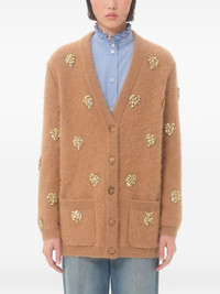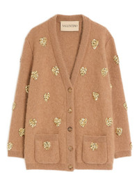 heart-embellished cardigan Highlights - Camel beige - Heart embellishments - Front button closure - Front patch pockets - V-neck - Long sleeves Made in Italy Composition Mohair 49%, Wool 31%, Polyamide 20% Washing instructions Read Manufacturer Guidelines