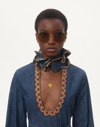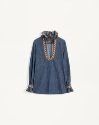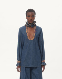 Embroidered Chambray Denim top and printed fabric border details - Wide neckline - Ruffle detail on collar and cuffs - Button closure on collar - Chambray Denim (100% Cotton) - Length: 73.5 cm / 28.9 in. from the center back in an Italian size 40 - The model is 176 cm / 5'9" tall and wears an Italian size 40 - Made in Italy The look of the model is completed by a Valentino Garavani 9TO5 Bag and Valentino Garavani Valet Du Roi Shoes. Product code: 6B0DB03E7MR_558