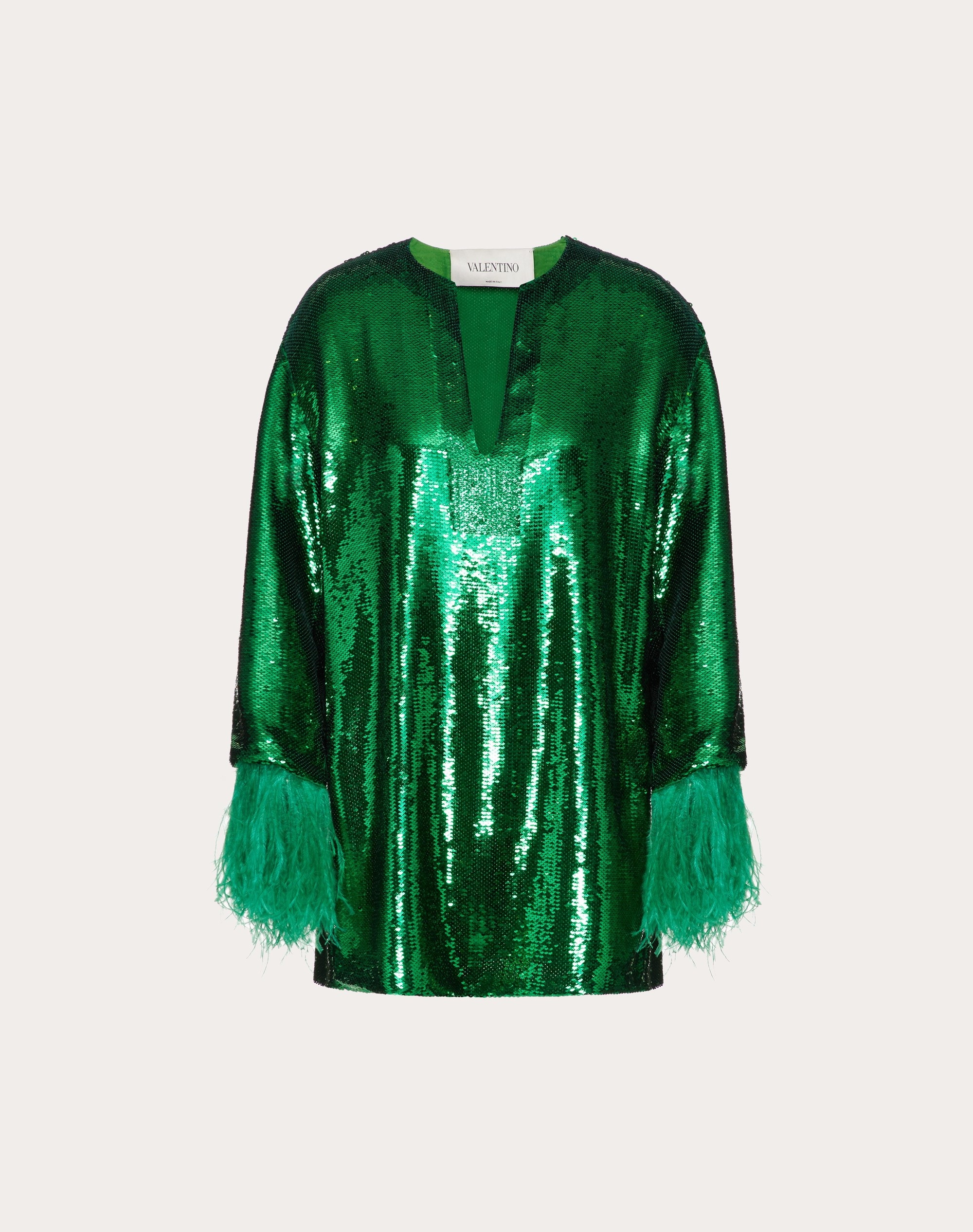 Embroidered Chiffon kaftan dress. - All-over sequins and feather embroidery on the cuffs - Chiffon (100% Silk) - Double-layer in Chiffon (100% Silk) - Length from shoulders: 85 cm/33.5 in for Italian size 40 - The model is 176 cm/5’9” tall and is wearing an Italian size 40 - Made in Italy Product Code BVAYD32UP_K04