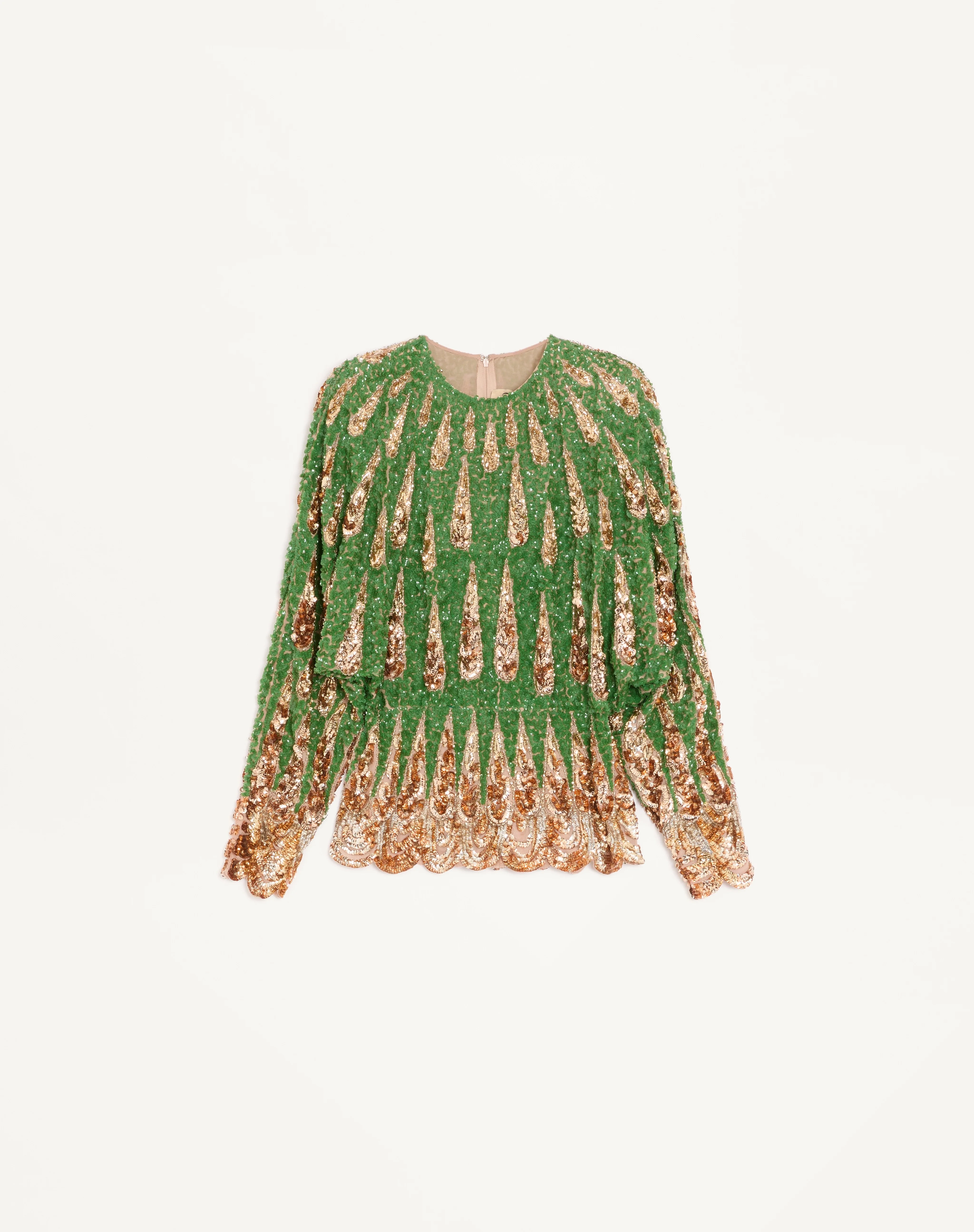 Chiffon top with all-over teardrop sequin embroidery - Basque with a scalloped edge - Back closure with zipper and hook - Chiffon (100% Silk) - Crepe De Chine Lining (100% Silk) - Length: 62 cm / 24.4 in. from the shoulders in an Italian size 40 - The model is 176 cm / 5'9" tall and wears an Italian size 40 - Made in Italy The look of the model is completed by a Valentino Garavani Bag and Valentino Garavani Shoes. Product code: 8B0AEBT52UP_M12