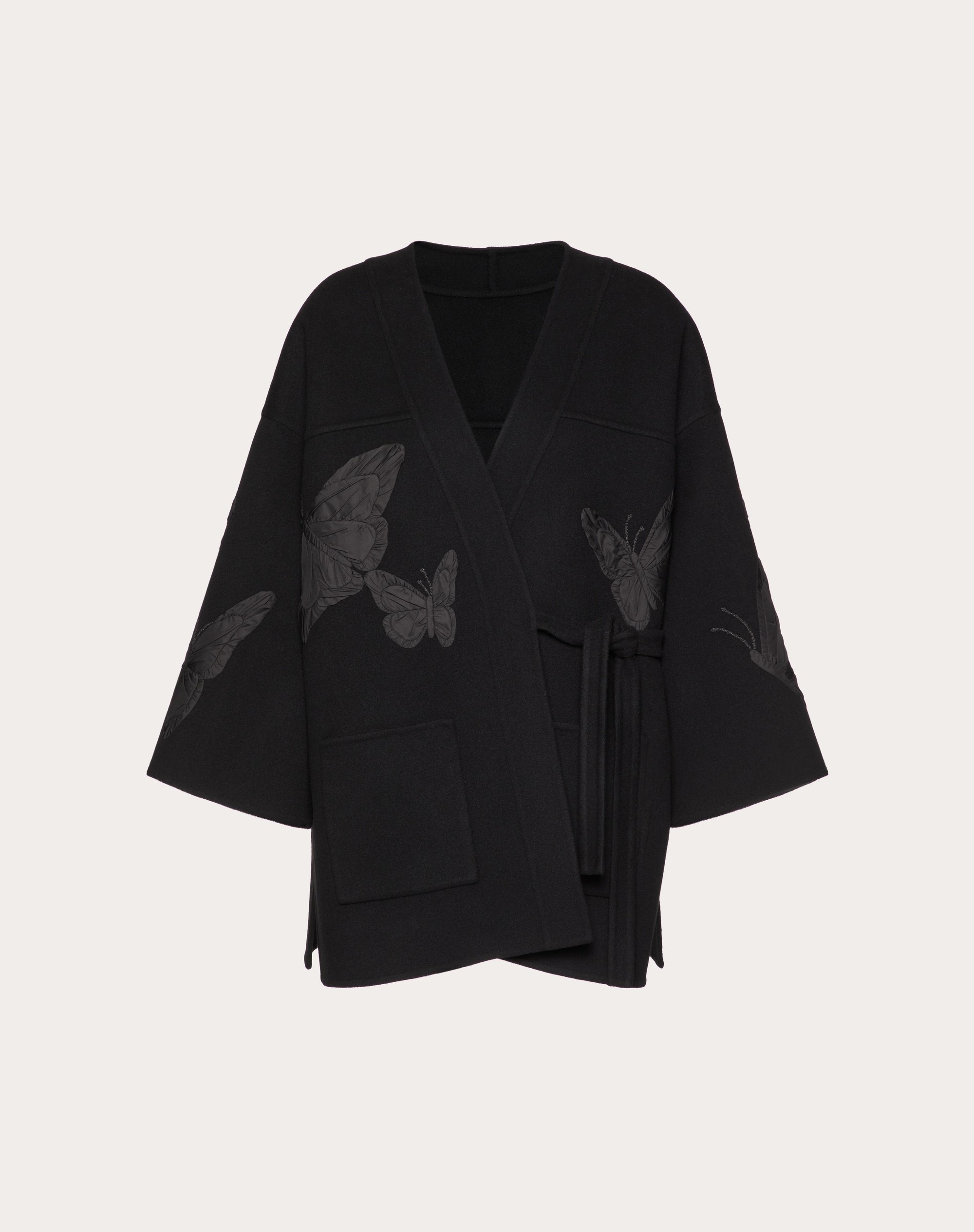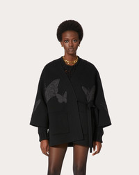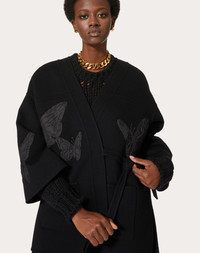 Embroidered Compact Drap kimono. - Valentino Utopia Butterfly fabric embroidery - Doubled technique - Front tie fastening - Compact Drap (90% Virgin Wool, 10% Cashmere Wool) - Unlined - Length from shoulders: 76 cm / 29.9 in. for Italian size 40 - The model is 176 cm / 5”9’ tall and is wearing an Italian size 40 - Made in Italy Product Code BCJ2I56JA_0NO