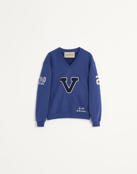 "V" College sweatshirt with le Chat de la Maison embroidery - V-neck - Cotton (100% Cotton) - Length: 63 cm / 24.8 in. from the shoulders in an Italian size S - The model is 176 cm / 5'9" tall and wears an Italian size S - Made in Italy The look of the model is completed by a Valentino Garavani Vain Bag and Valentino Garavani Adamantine Shoes. Product code: 7B3MF24V9KY_AF9