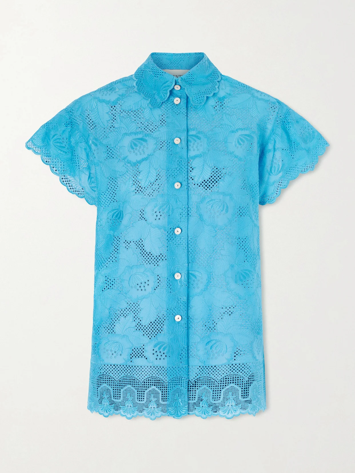 Airy and intricately detailed, Valentino Garavani's shirt brings a sense of romance to warm-weather dressing. Cut from broderie anglaise cotton, it's defined by delicate floral embroidery, scalloped edges and fluttery sleeves. Wear yours with the matching pants in our edit.