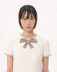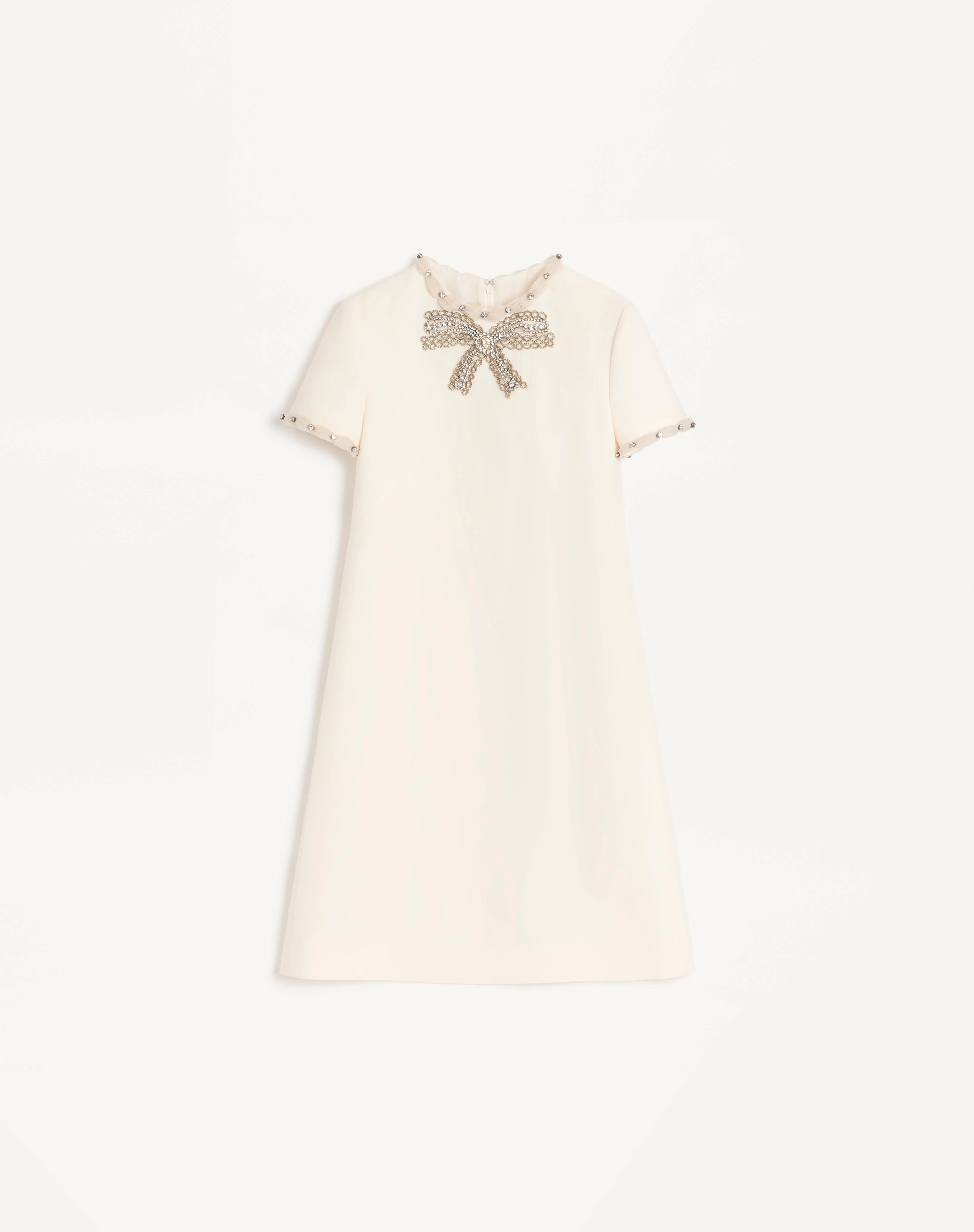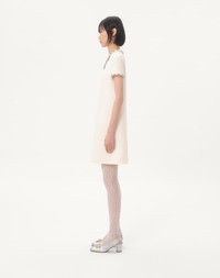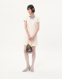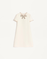 Crepe Couture short dress with embroidered bow - Embroidered trim detail on neckline and sleeves - Rear zipper closure - Crepe Couture (65% Virgin Wool, 35% Silk) - Habotai lining (100% Silk) - Length: 90 cm / 35.4 in. from the shoulders in an Italian size 40 - The model is 176 cm / 5'9" tall and wears an Italian size 40 - Made in Italy The look of the model is completed by a Valentino Garavani Vain Bag and Valentino Garavani Adamantine Shoes. Product code: 7B3VADR91CF_A03