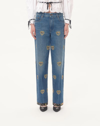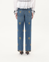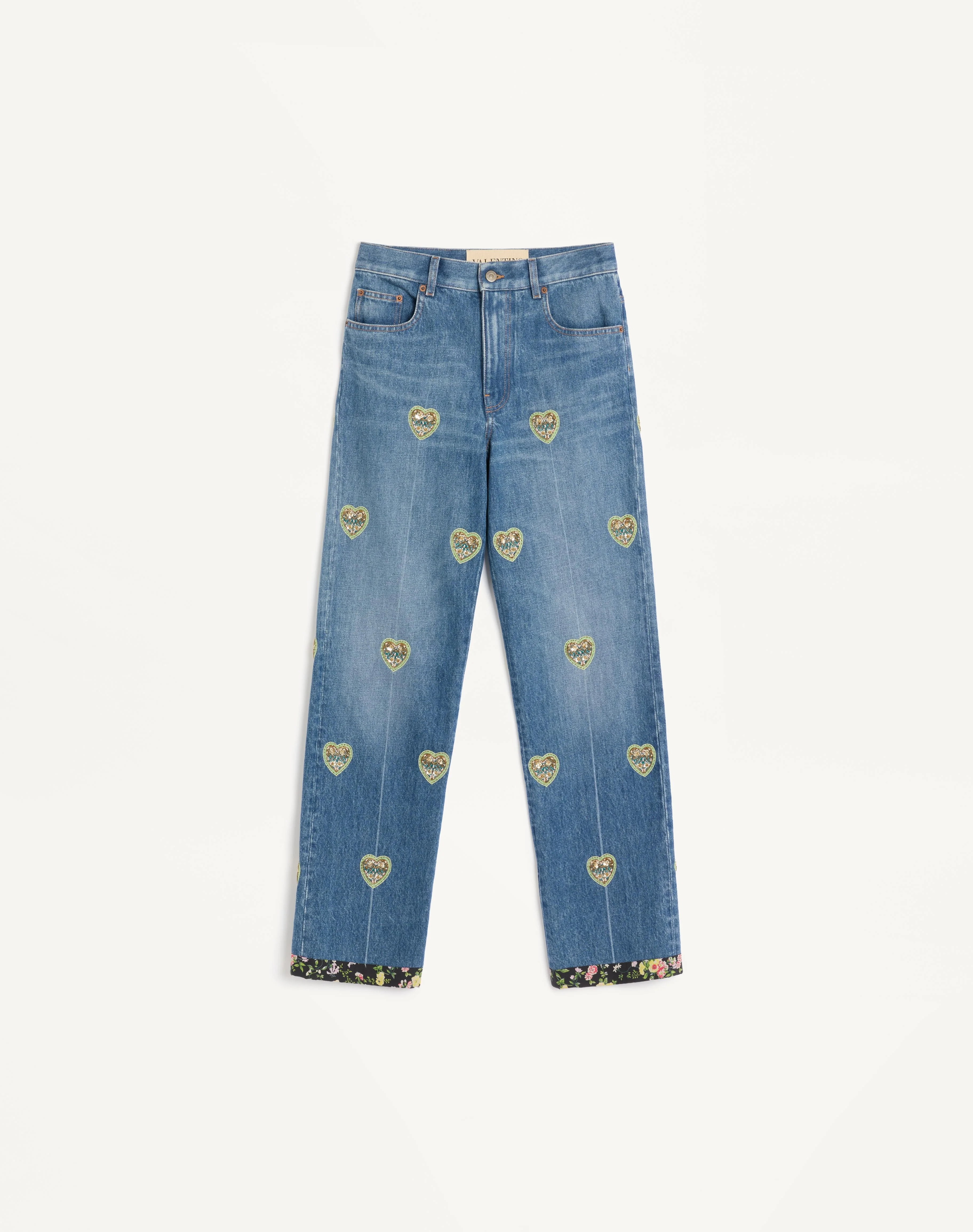 Denim pants with heart embroidery - Floral fabric trim detail - Front closure with button and zip - Medium Blue Denim (100% Cotton) - Length: 100 cm / 39.4 in. from the waist in an Italian size 40 - The model is 176 cm / 5'9" tall and wears an Italian size 40 - Made in Italy The look of the model is completed by a Valentino Garavani Nellcote Bag and Valentino Garavani Hi Dolly Shoes. Product code: 7B3DD20C9KH_558