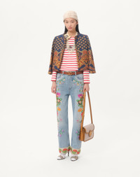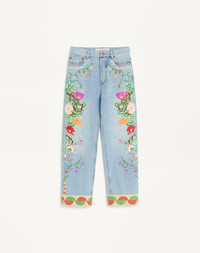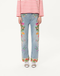Embroidered Denim Pants - Colored floral and element embroidery - Jacquard hems - Front closure with button and zipper - Denim ( 100% cotton ) - Length: 102 cm / 40.1 in. from the waist in an Italian size 40 - Leg opening: 22.5 cm / 8.8 in. in an Italian size 40 - Inseam: 74 cm / 29.1 in. in an Italian size 40 - The model is 176 cm / 5'9" tall and wears an Italian size 40 - Made in Italy The look of the model is completed by a Valentino Garavani 9TO5 Bag and Valentino Garavani Shoes. Product code: 6B3DD19F94S_508