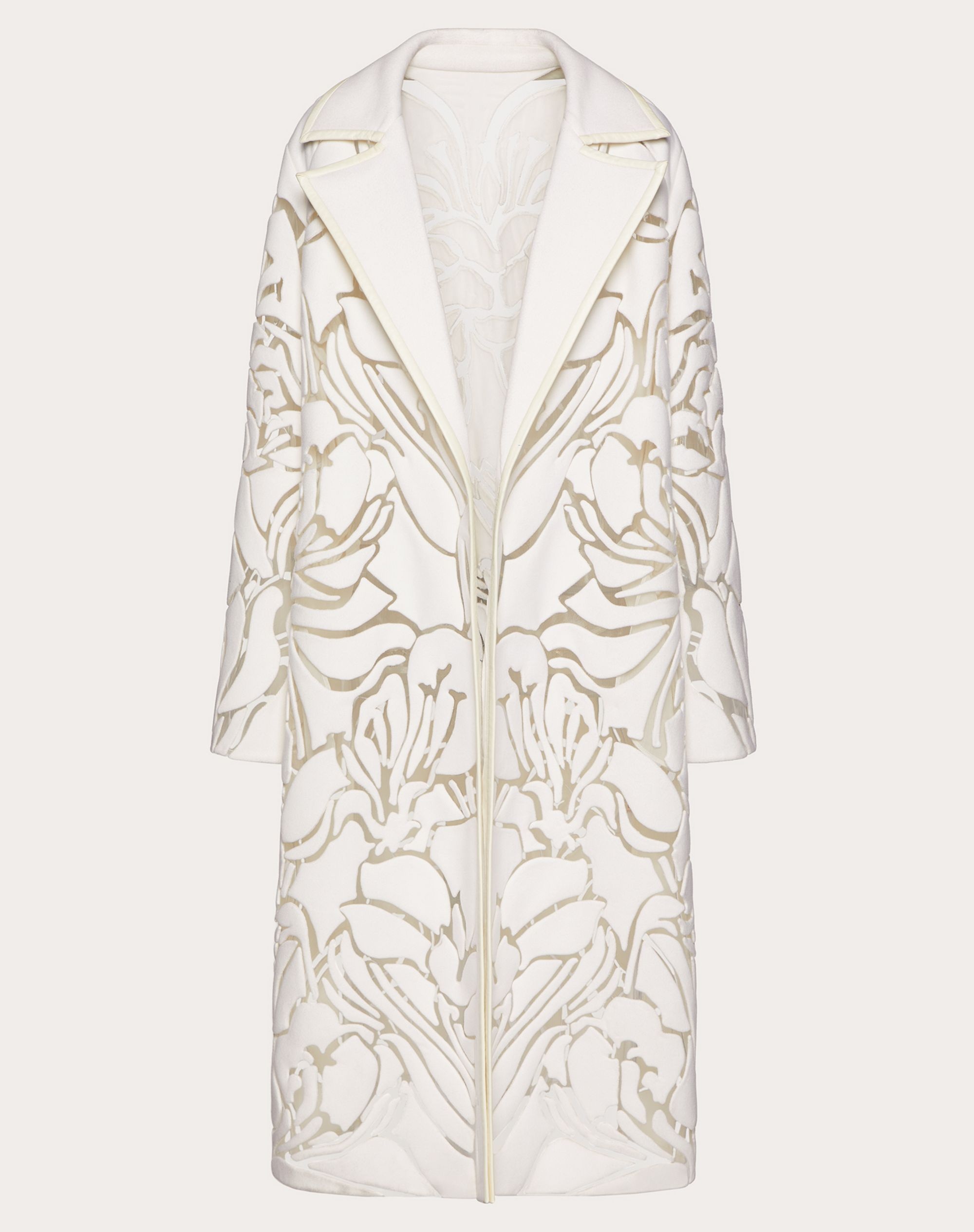 Coat in embroidered Melton Felt. - Floral cut-out embroidery - Front button closure - Melton Felt (100% Wool) - Unlined - Length from shoulders: 119 cm / 46.8 in. for Italian size 40 - Sleeve length: 83 cm / 32.7 in. from center back for Italian size 40 - The model is 176 cm / 5’9” tall and is wearing an Italian size 40 - Made in Italy Product Code: XB0CA5V43NAA03