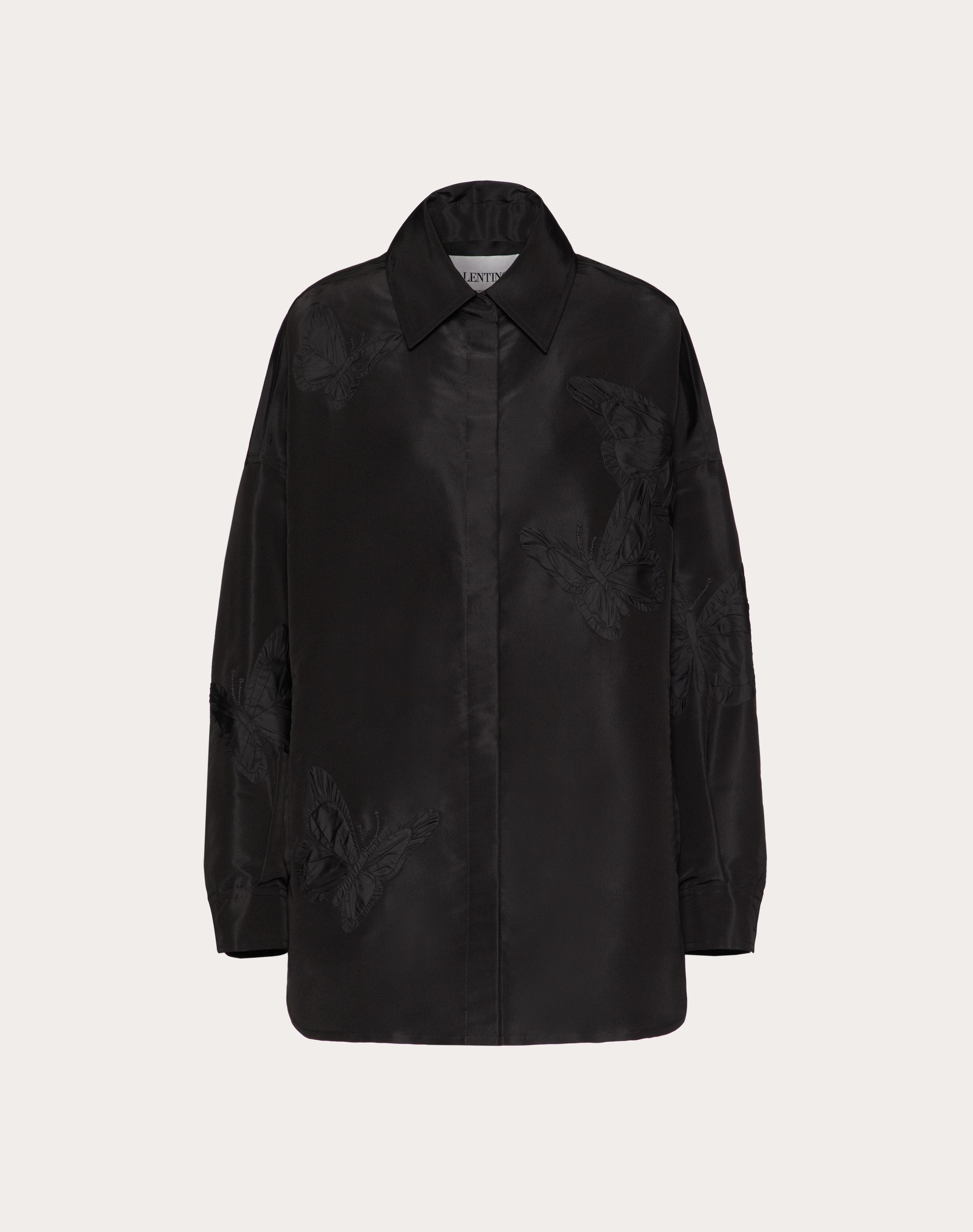 Embroidered micro faille overshirt. - Valentino Utopia Butterfly fabric embroidery - Oversize fit - Front button fastening - Micro Faille (54% Cotton, 46% Polyester) - Unlined - Length from shoulders: 78 cm / 30.7 in. for Italian size 40 - The model is 176 cm / 5”9’ tall and is wearing an Italian size 40 - Made in Italy Product Code BCIBR14H2_0NO