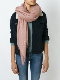 embroidered polka dot scarf Pink and gold-tone cashmere-silk-wool blend Valentino embroidered polka dot scarf from Valentino featuring frayed edges and embroidered stars and polka dots. Made in Italy Composition Outer: Cashmere 50%, Silk 30%, Wool 20% SIZE & FIT Model measurements Height 5 ft 10 in(1.78 m) Bust/Chest 29.52 in(75 cm) Hips 34.64 in(88 cm) Waist 23.62 in(60 cm) Measurement WIDTH 51.18 in(130 cm) LENGTH 57.08 in(145 cm) Washing instructions Dry Clean Only