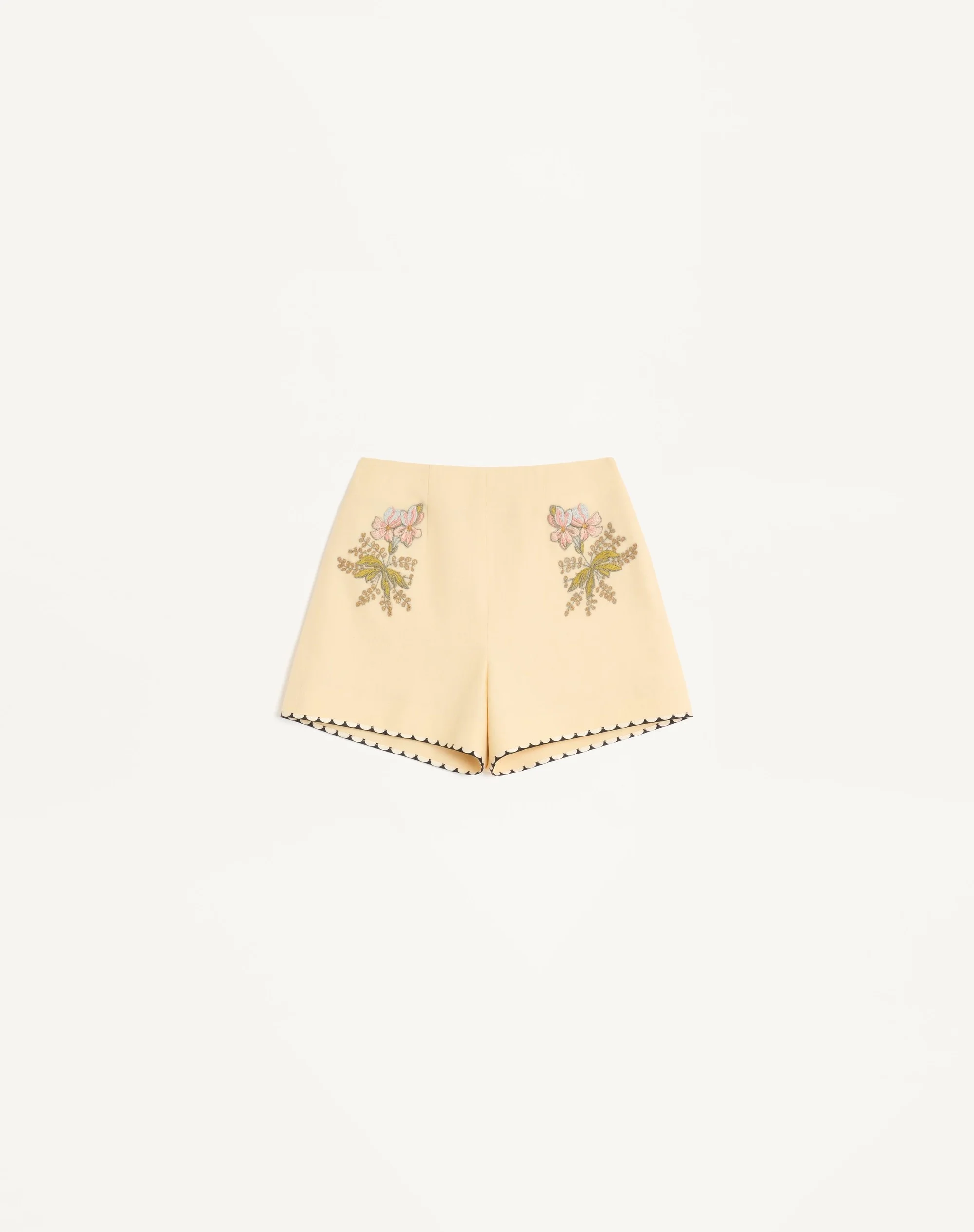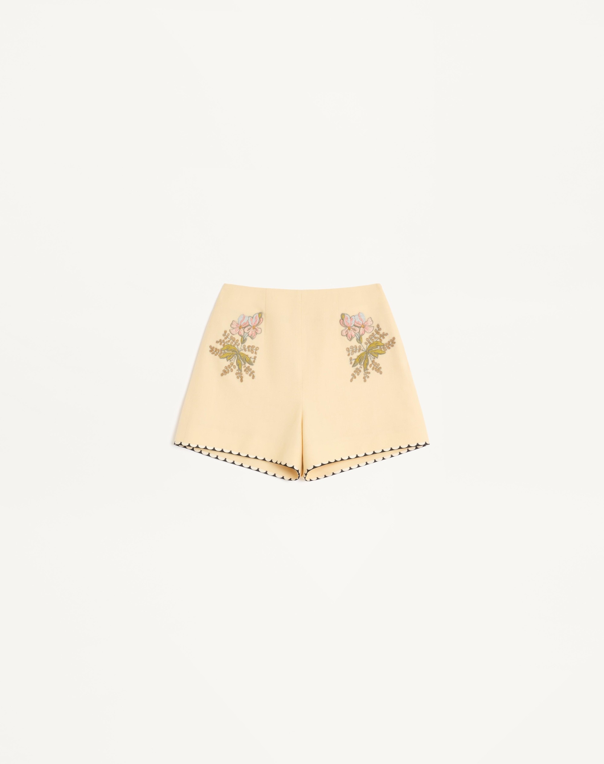 Shorts with floral thread embroidery - Twill borders in Plus de Pois print - Side zipper closure - Viscose Linen (86% Viscose, 14% Linen) - Unlined - Length: 35 cm / 13.8 in. from the waist in an Italian size 40 - The model is 176 cm / 5'9" tall and wears an Italian size 40 - Made in Italy Product code: 7B3RF2W39EK_R0R