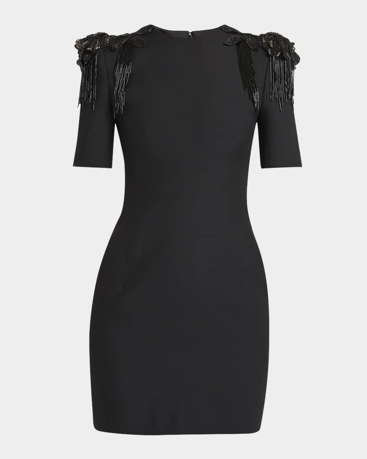 - Valentino Garavani couture crepe dress featuring sequin beaded fringe embellished shoulders - Round neckline - Short sleeves - Padded shoulders - Sheath silhouette - Mini length - Back zip - Virgin wool/silk - Made in Italy