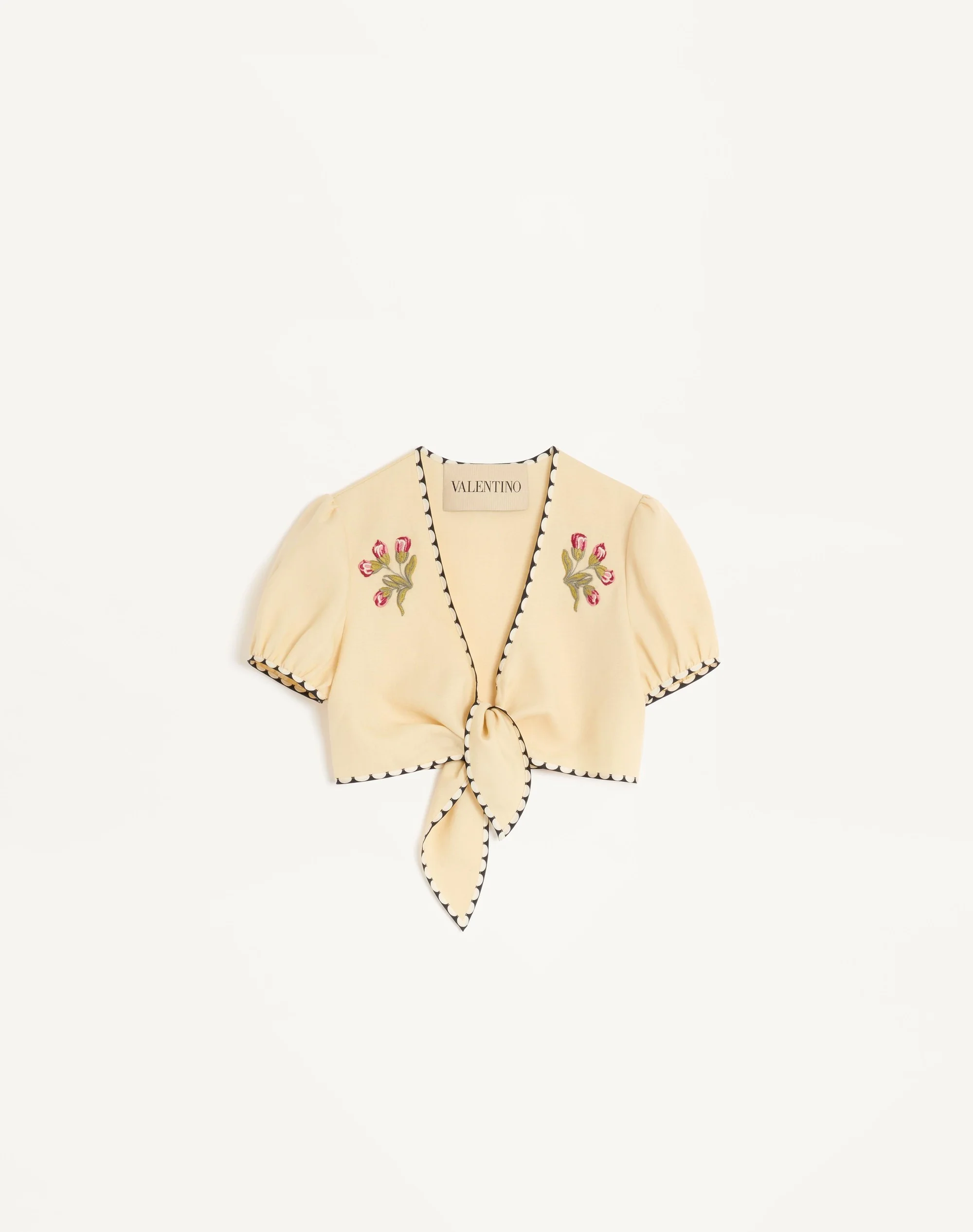Top with floral thread embroidery - Plus de Pois print with Twill borders - Front bow fastening - Viscose Linen (86% Viscose, 14% Linen) - Unlined - Length: 37 cm / 14.6 in. from the waist in an Italian size 40 - The model is 176 cm / 5'9" tall and wears an Italian size 40 - Made in Italy Product code: 7B3AEAZ29EK_R0R