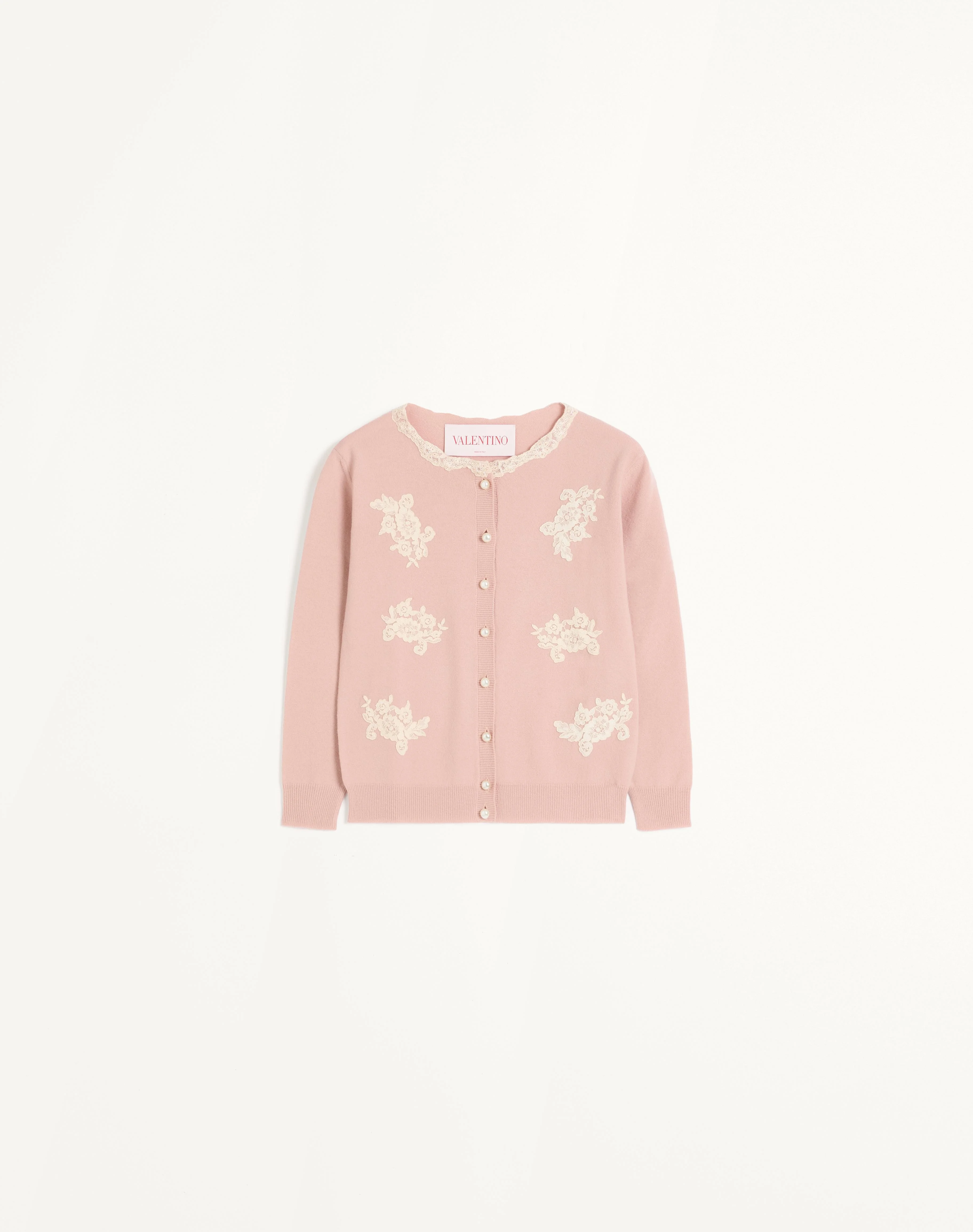 Embroidered Wool and Lace Cardigan - Lace embroidery - Front closure with pearl buttons - Wool and Lace (100% Virgin Wool) Length: 55 cm / 21.7 in. from the shoulders in an Italian size S - Sleeve length: 68 cm / 26.8 in. from the center back in an Italian size S - The model is 176 cm / 5'9" tall and wears an Italian size S - Made in Italy The look of the model is completed by a Valentino Garavani Quiltie 67 Bag and Valentino Garavani Bowow Shoes. Product code: 6B3KA09E938_BYC