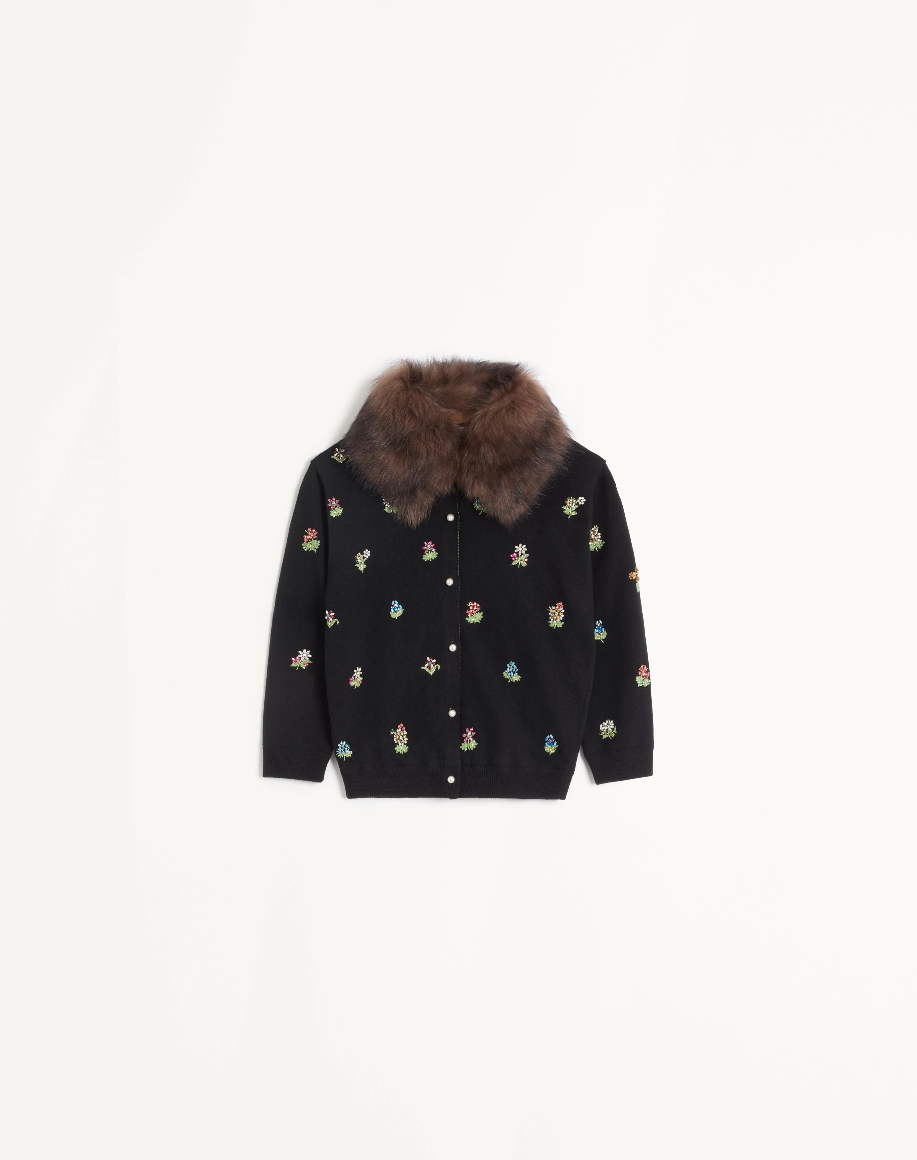 Embroidered Wool Cardigan - Micro element embroidery - Removable Tuscan Sheepskin collar - Front closure with Pearl buttons - Wool (100% Virgin Wool) - Jacquard lining with a diagonal stripe pattern with flowers and VLogo (75% Acetate, 25% Silk) - Length: 52 cm / 20.5 in. from the shoulders in an Italian size S - Sleeve length: 60 cm / 23.6 in. from the center back in an Italian size S - The model is 176 cm / 5'9" tall and wears an Italian size S - Made in Italy The look of the model is completed by a Valentino Garavani Viva Superstar Bag and Valentino Garavani Bay By Bay Shoes. Product code: 6B3KA09N91L_0NO