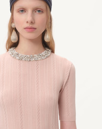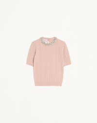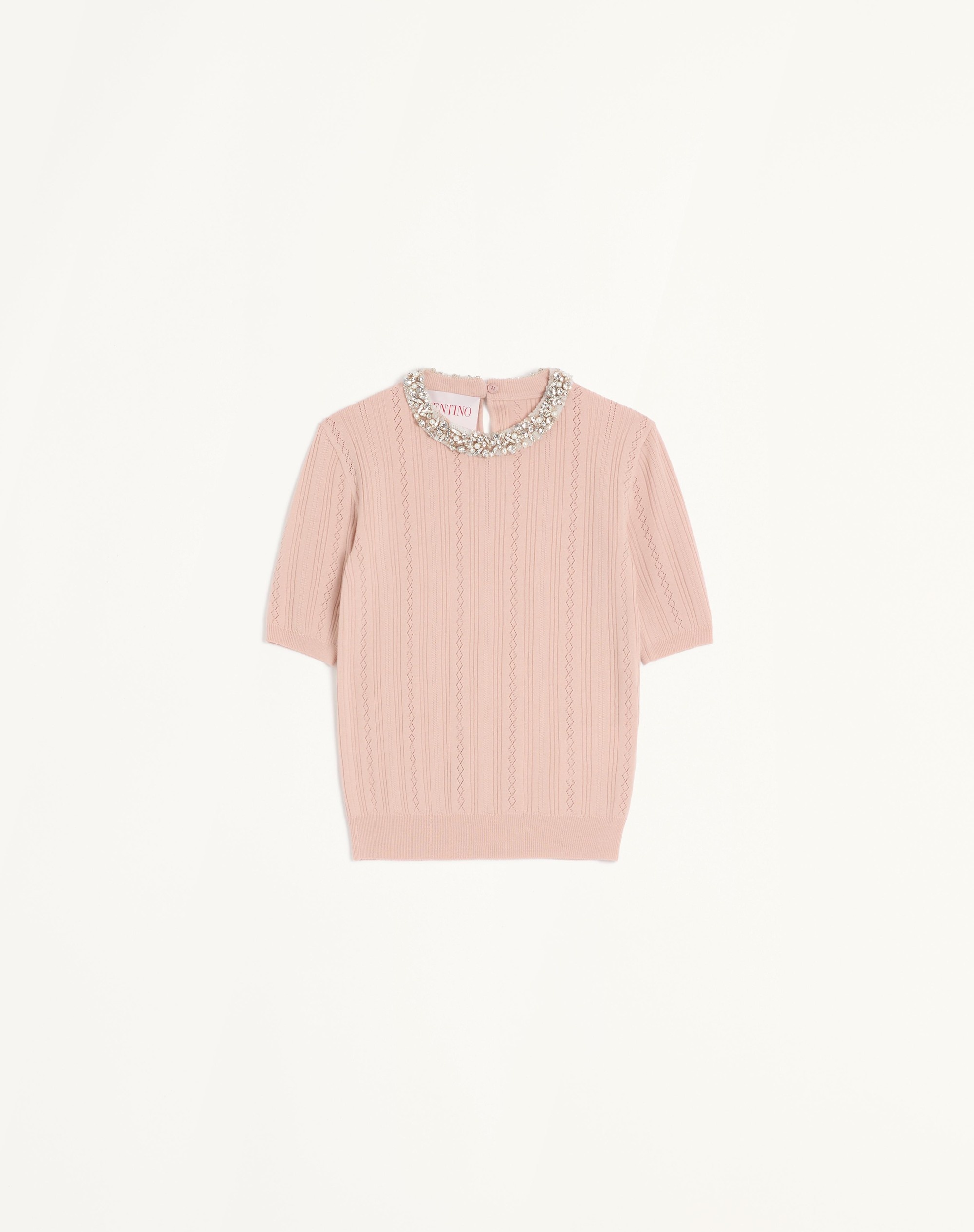 Embroidered Wool Sweater - Stone and micro element embroidery on neckline - Rear closure with mother-of-pearl teardrop - Wool (100% Virgin Wool) - Length: 54 cm / 21.2 in. from the shoulders in an Italian size S - Sleeve length: 44 cm / 17.3 in. from the center back in an Italian size S - The model is 176 cm / 5'9" tall and wears an Italian size S - Made in Italy The look of the model is completed by a Valentino Garavani Vain Bag and Valentino Garavani Bowow Shoes. Product code: 6B3KC63J96E_N17