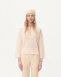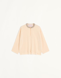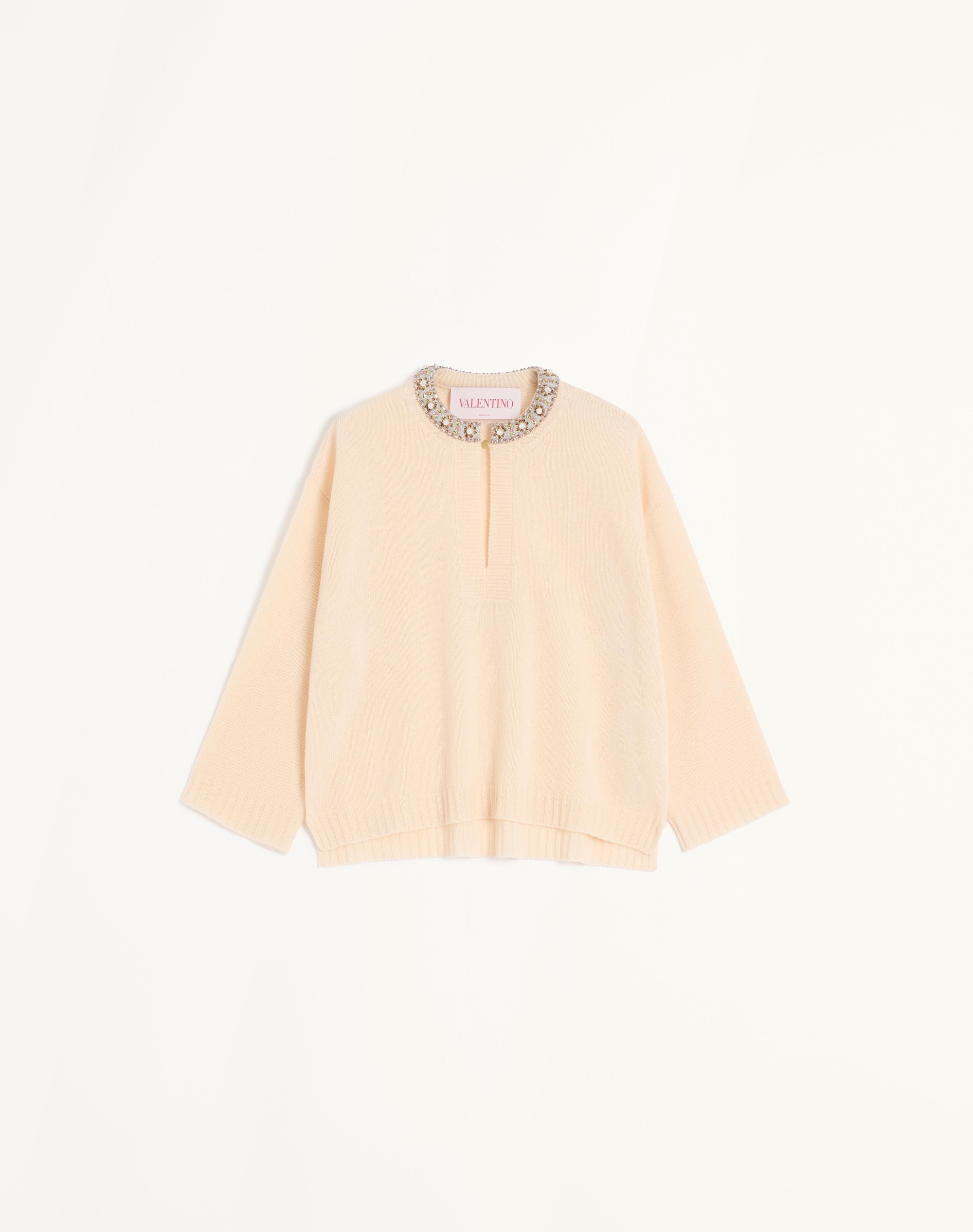 Embroidered Wool Sweater - Stone and micro element embroidery on neckline - Front closure with flower button - Wool (100% Virgin Wool) - Length: 56 cm / 22 in. from the shoulders in an Italian size S - Sleeve length: 67 cm / 26.3 in. from the center back in an Italian size S - The model is 176 cm / 5'9" tall and wears an Italian size S - Made in Italy The look of the model is completed by a Valentino Garavani Loco Bag and Valentino Garavani Ladycrush Shoes. Product code: 6B3KC63H968_ET5