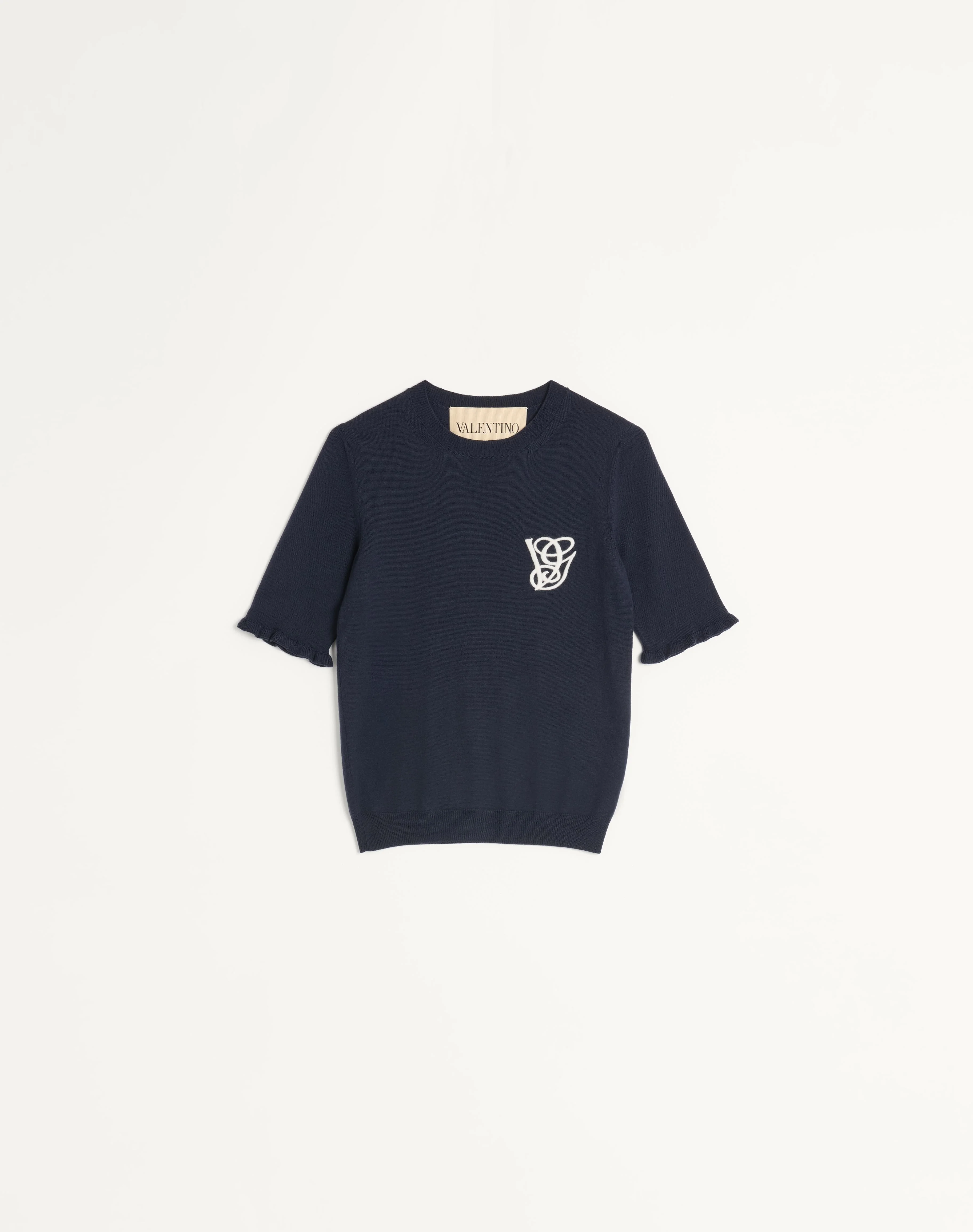 Wool Top with VG Embroidery - Ruffle Detail - Wool (100% Virgin Wool) - Length: 55 cm / 21.6 in. from the shoulders in an Italian size S - The model is 176 cm / 5'9" tall and wears an Italian size S - Made in Italy The look of the model is completed by a Valentino Garavani 9TO5 Bag and Valentino Garavani Adamantine Shoes. Product code: 7B3KC66H9HF_BBE