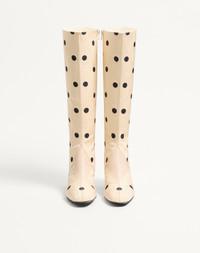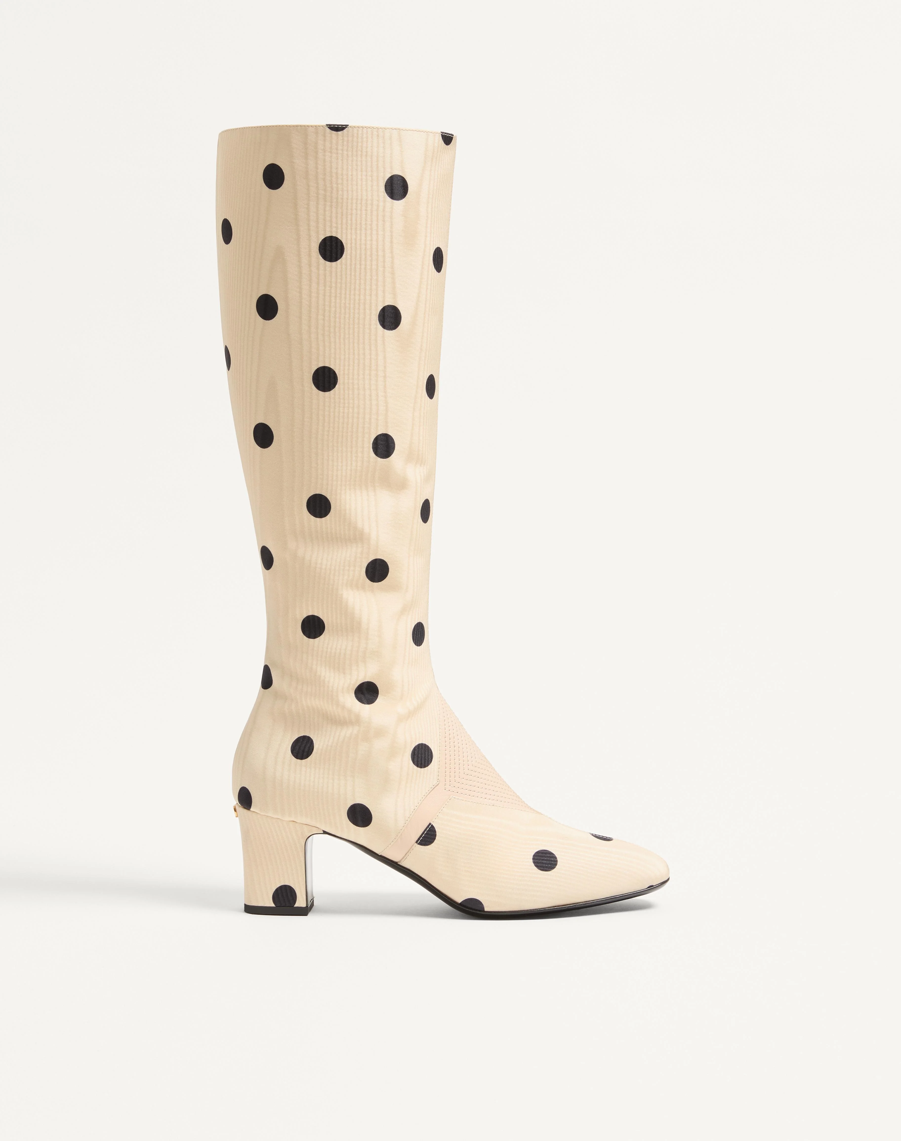 Valentino Garavani Equivoque boot in moire fabric (100% silk) with Plus de pois print - VLogo Signature detail with antique effect brass finish on the heel - Leather insert with stitched geometric rhombus pattern - Side zipper closure - Fabric-covered block heel - Heel height: 60mm/2.4 in. - Shaft height: 38 cm/15 in. ; Italian size 37 - Made in Italy Product code: 6W0S0LW5JUT_BKL