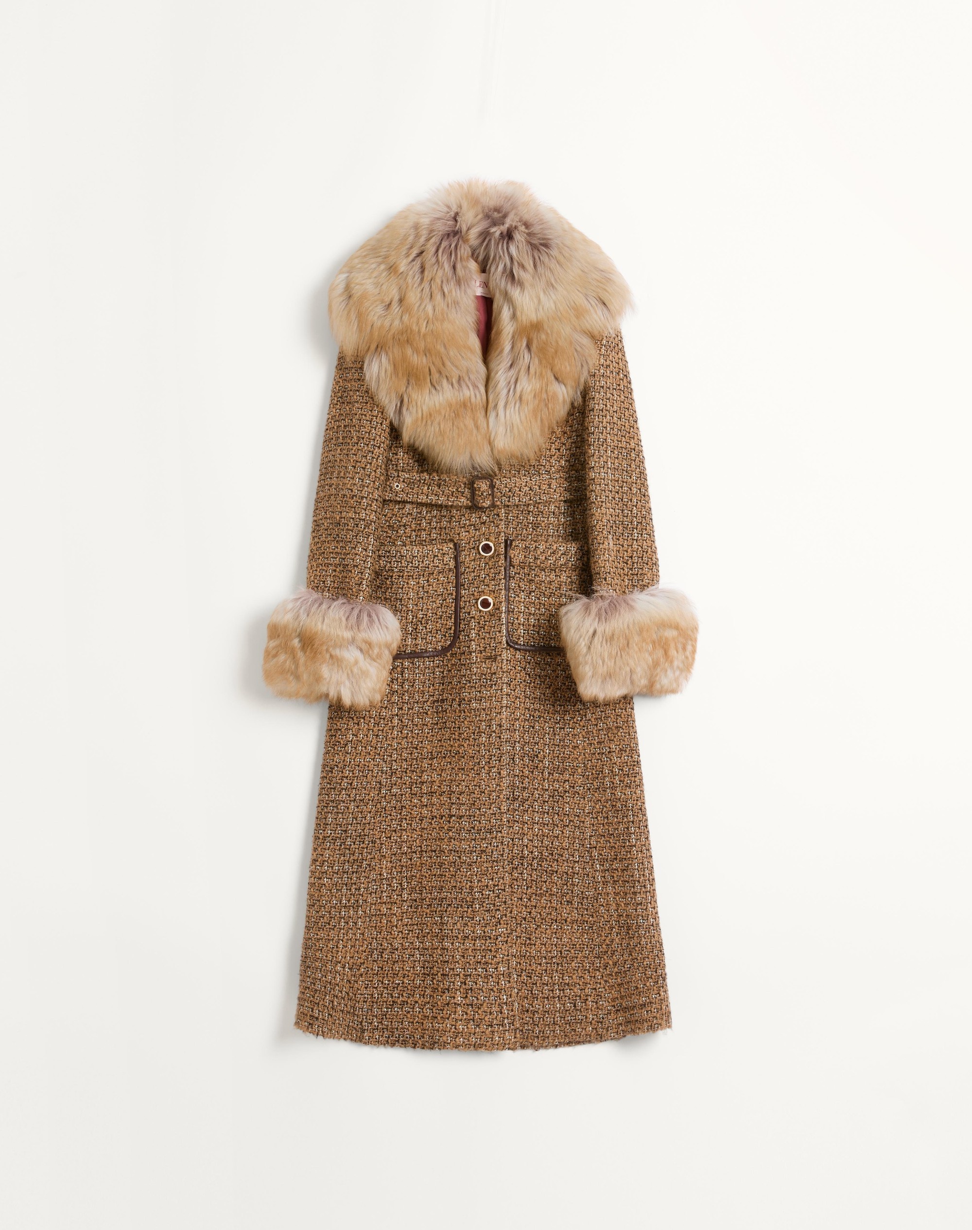 Fantasy Tweed Coat - Sheepskin inserts on neckline and cuffs - Waist belt - Fantasy Tweed (60% Virgin Wool, 32% Acrylic, 5% Polyamide, 3% Polyester) - Length: 130 cm / 51.2 in. from the shoulders in an Italian size 40 - Sleeve length: 80 cm / 31.5 in. from the center back in an Italian size 40 - The model is 176 cm / 5'9" tall and wears an Italian size 40 - Made in Italy The look of the model is completed by a Valentino Garavani 9TO5 Bag and Valentino Garavani Ladycrush Shoes. Product code: 6B3CA7I590M_G48