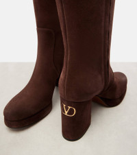 The most established Italian Maison de Couture, Valentino Garavani has become a symbol of excellence, creativity, and uniqueness. Made in Italy from supple brown suede, the Fawcette knee-high boots feature the brand's iconic VLogo and rest atop 80mm heels and platform soles. Product Details - Upper: leather (suede) - Lining: leather - Sole: leather insole, leather and rubber sole - Toe shape: round toe - Made in Italy - Includes: shoe box, dust bag - Designer color name: Testa Di Moro - Item color: brown - Closure: zipped side - Item number: P01102138 Size & Fit - True to size - European sizes - 9cm-3.5" heel (size EU 38) - 3cm-1" platform (size EU 38) - 39cm-15.5" shaft height (size EU 38) - 38cm-15" shaft width (size EU 38) - shaft width measured on largest part of boot