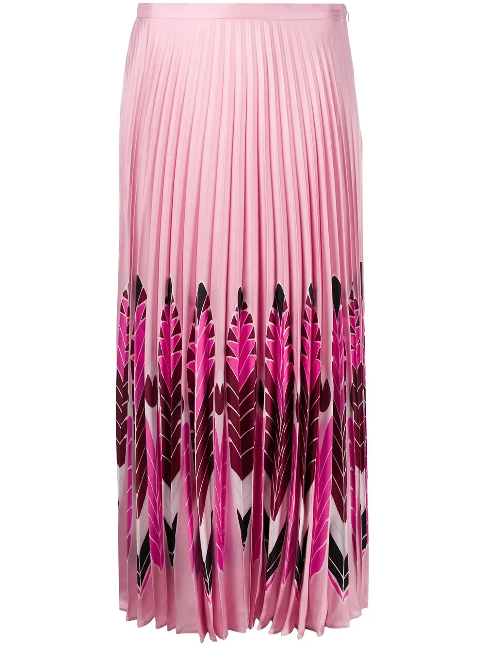 feather print pleated midi skirt Birds of a feather flock together. This feather print pleated midi skirt, however, pairs brilliantly with pretty much anything in your wardrobe. Fuss-free style, courtesy of Valentino Garavani. Highlights - Valentino ready to wear - Tonal pink - Silk - Fully pleated - Feather print - High-waisted - Mid-length - Side zip fastening Made in Italy Composition Silk 100% SIZE & FIT Model measurements Height 5 ft 10 in(1.78 m) Bust/Chest 33.07 in(84 cm) Hips 35.82 in(91 cm) Waist 25.98 in(66 cm) FittingInformation This piece fits true to size. We recommend you get your regular size Designed to be fitted at the waist, loose over the leg Made with a mid-weight non-stretch fabric Washing instructions Read Manufacturer Guidelines