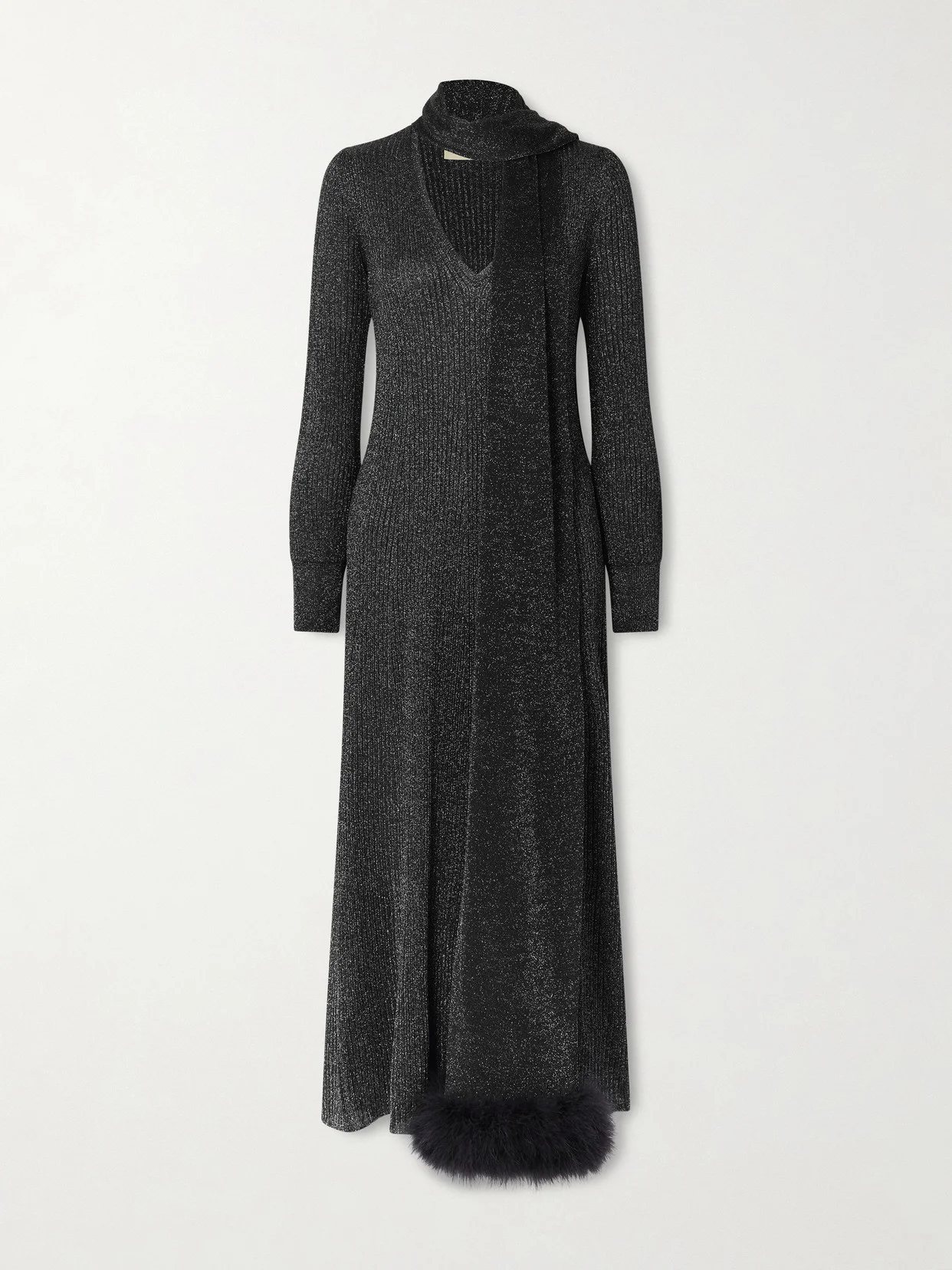 Scarf-detailed Feather-trimmed Metallic Ribbed-knit Midi Dress