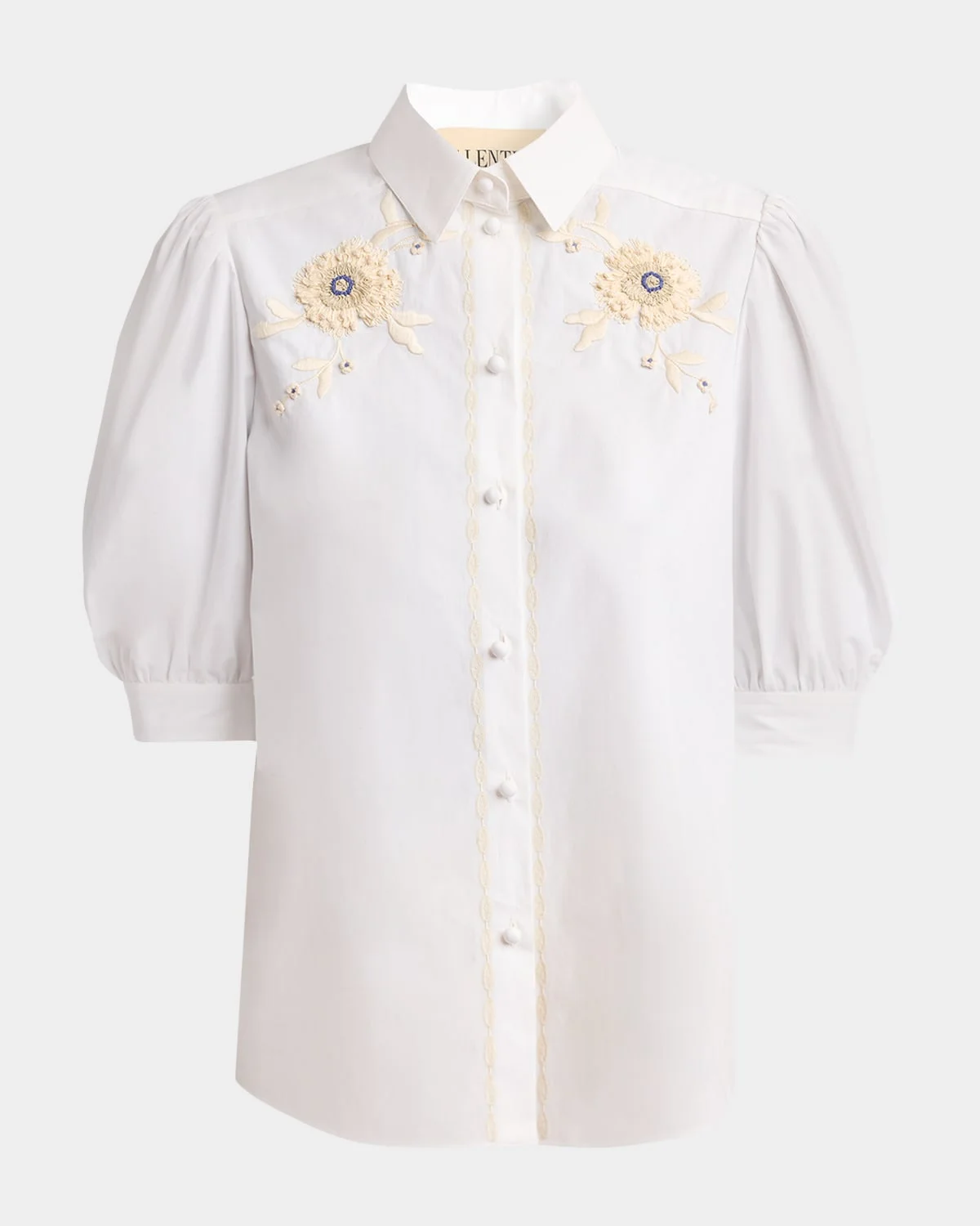 Crafted from crisp cotton poplin, this shirt from Valentino Garavani features floral embroidery on the chest and voluminous sleeves Point collar; button front Short puff sleeves; button cuffs Gathered box yoke Relaxed fit Hip length Curved hem Cotton Made in Italy
