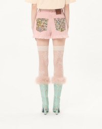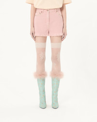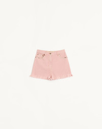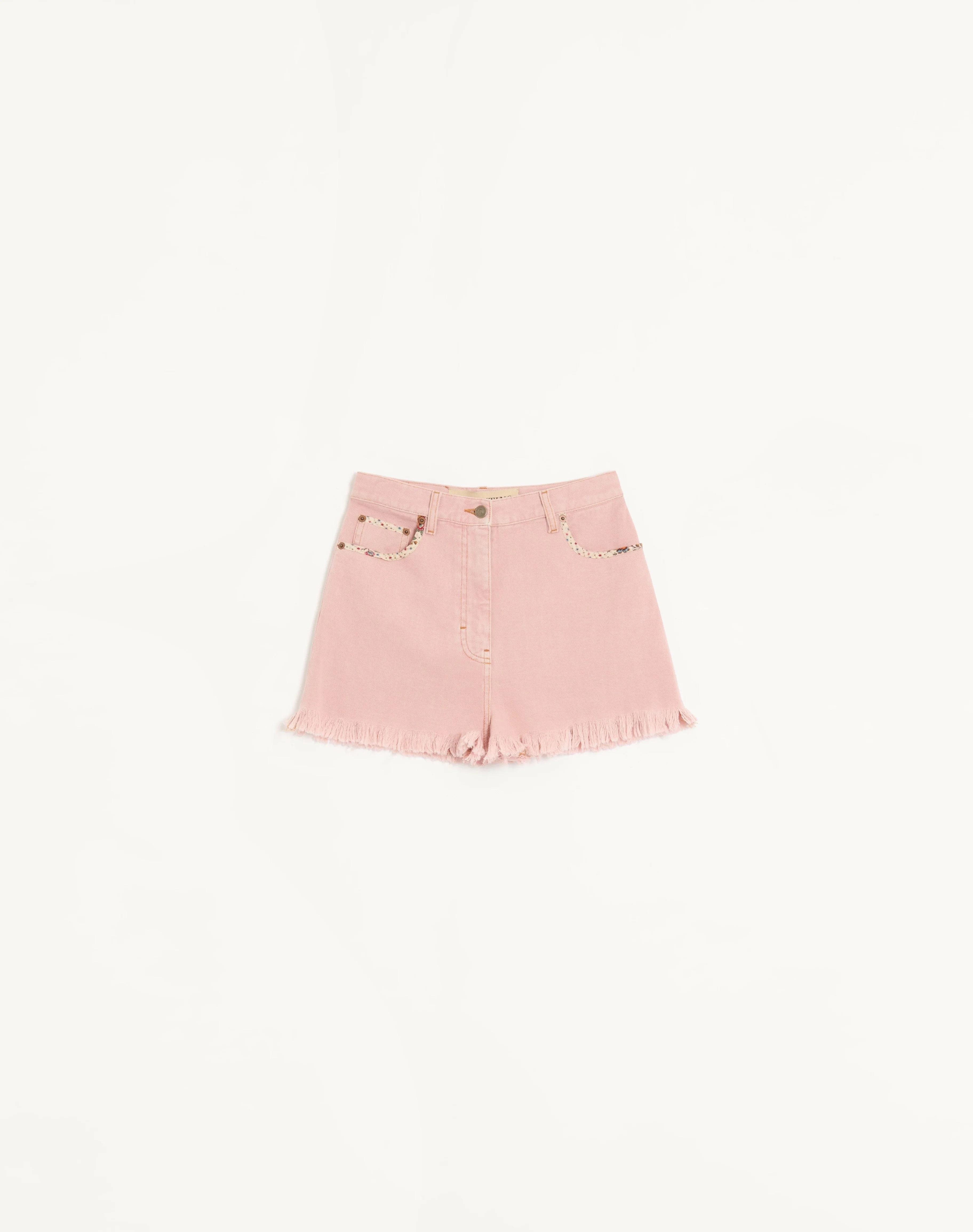 Denim shorts with frayed hem - Front zipper and button closure - Pink denim (100% cotton) - Length: 34.5 cm / 13.5 in. from the waist in an Italian size 40 - The model is 176 cm / 5'9" tall and wears an Italian size 40 - Made in Italy The look of the model is completed by a Valentino Garavani Panthea Bag and Valentino Garavani Hotty Shoes. Product code: 8B3DDB8S9Y9_O45