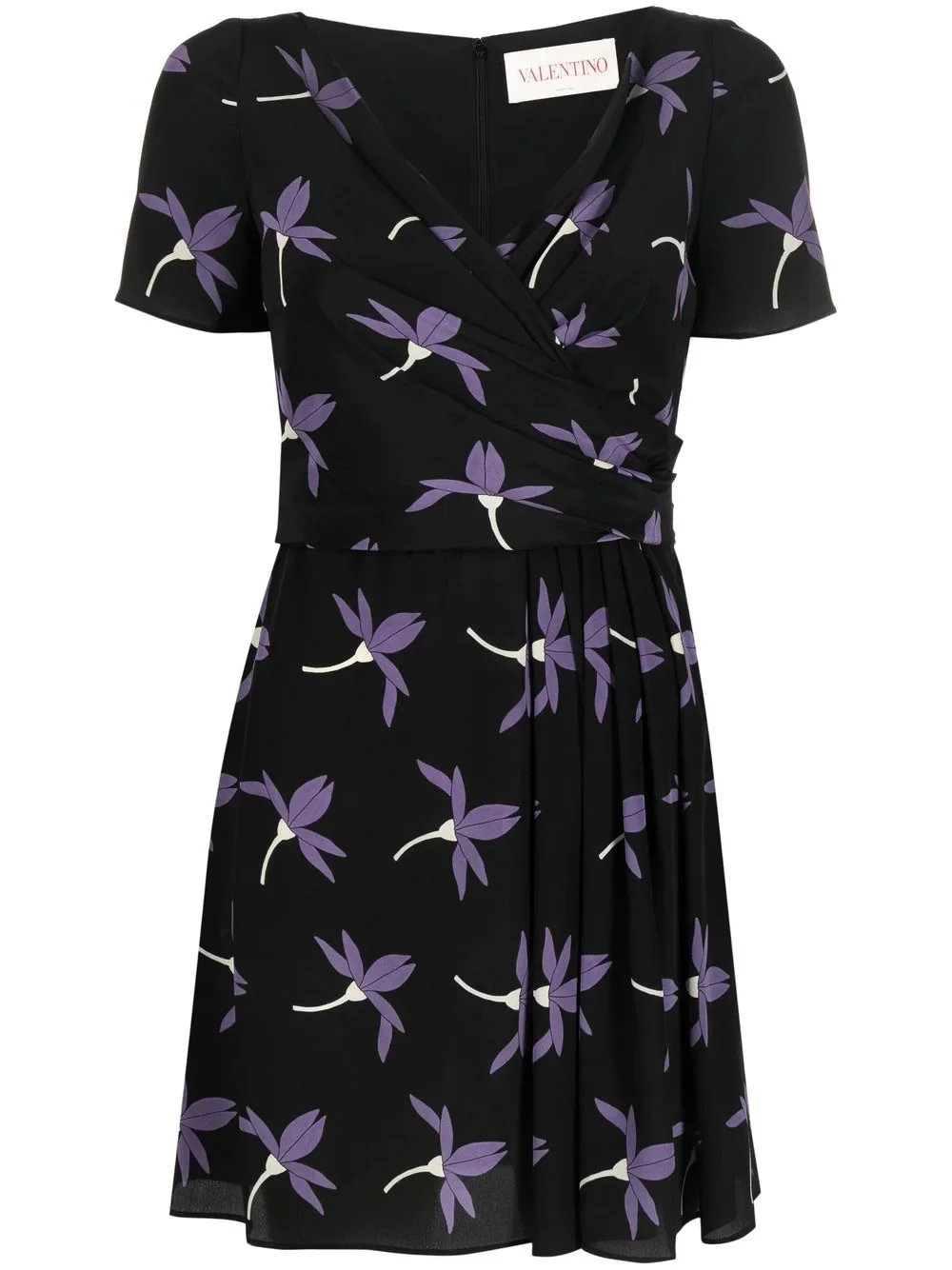 floral-print pleated dress Valentino Garavani gives a delicate finish to this mini dress: besides being decorated with an all-over floral pattern, this piece boasts a pleated design that adds to a billowing silhouette. Highlights - Valentino ready to wear - Black/violet/white - Stretch-silk - All-over floral print - Fully pleated - Crossover neck - Short sleeves - A-line skirt Made in Italy Composition Outer: Silk 100% Lining: Viscose 91%, Spandex/Elastane 9% Washing instructions Dry Clean Only