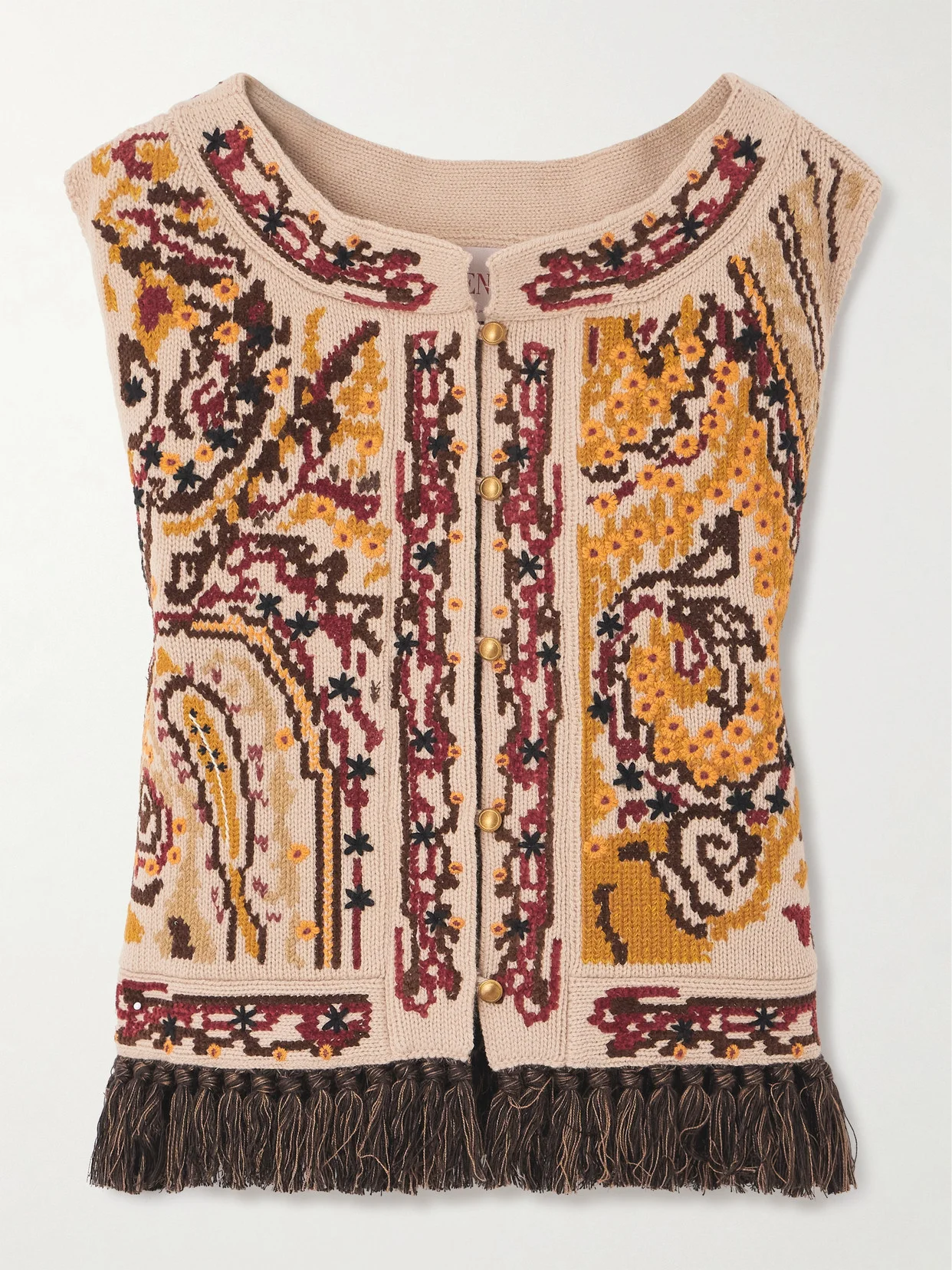 Valentino Garavani's vest is from Cruise '25, Alessandro Michele's debut collection for the house. Evoking the bohemian arc of the brand's '70s archive, it's knitted from wool with velvety embroidery, fringed trims and antiqued buttons.