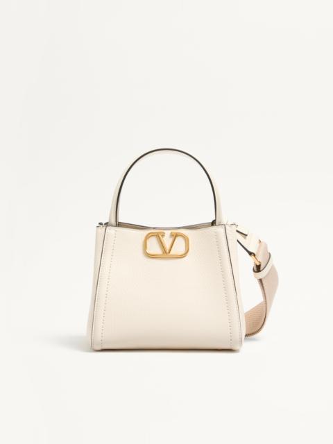 Valentino Garavani Alltime small handbag in grainy calfskin with metallic VLogo Signature element. The bag can be worn over the shoulder/crossbody thanks to the shoulder straps or carried by hand with the leather handles. - Antique brass-finish hardware - Magnetic closure - Adjustable and detachable ribbon shoulder strap - Adjustable and detachable leather shoulder strap - Protective feet - Interior: one zippered pocket - Leather shoulder strap drop length: 50 cm / 19.7 in. - Dimensions: W19xH17xD14 cm / W7.5xH6.7xD5.5 in. - Made in Italy Product code: 5W2B0Q26IMZ_ZG5