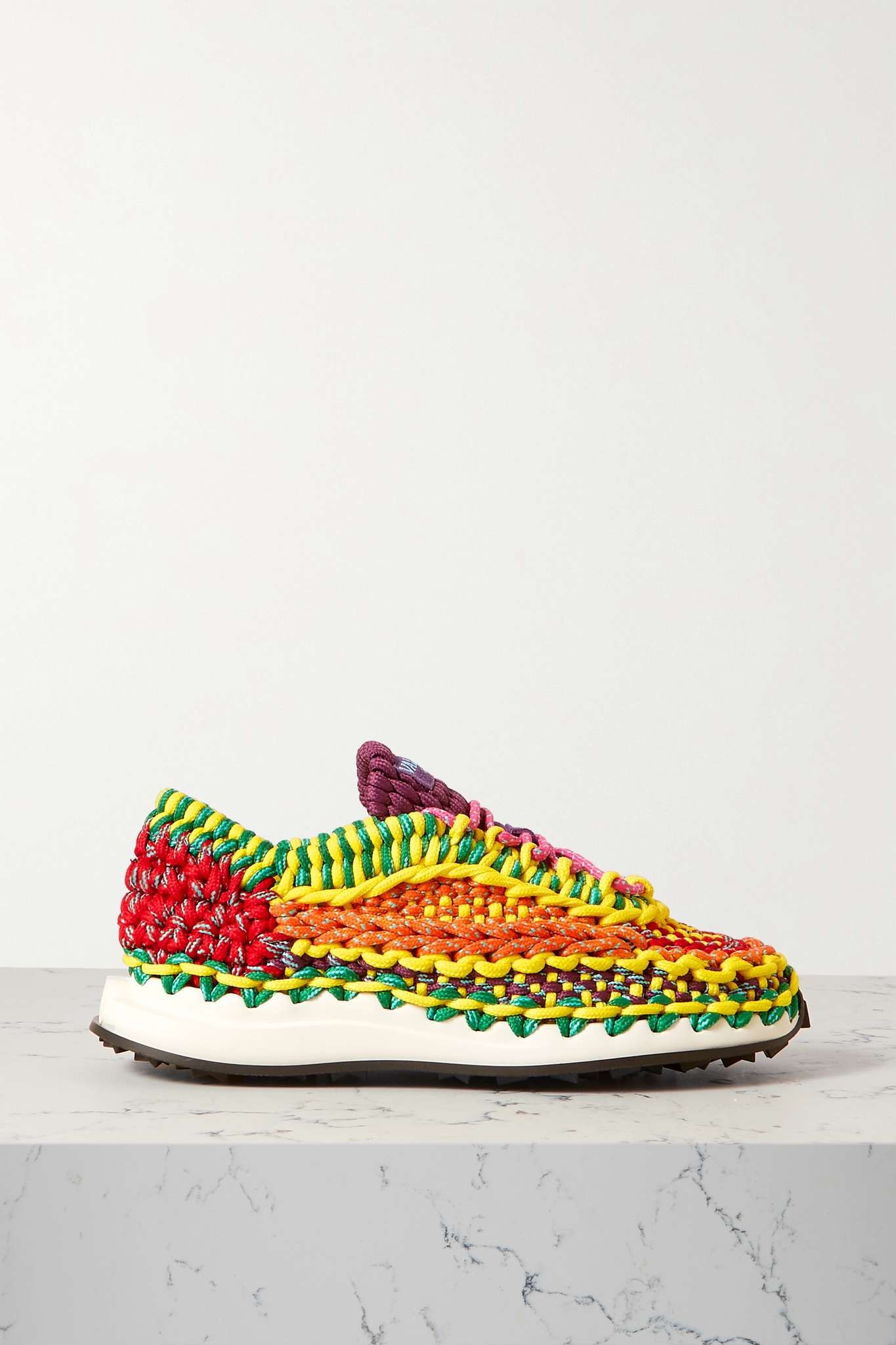 - Rubber sole measures approximately 25mm/ 1 inch - Multicolored crochet-knit - Lace-up front
