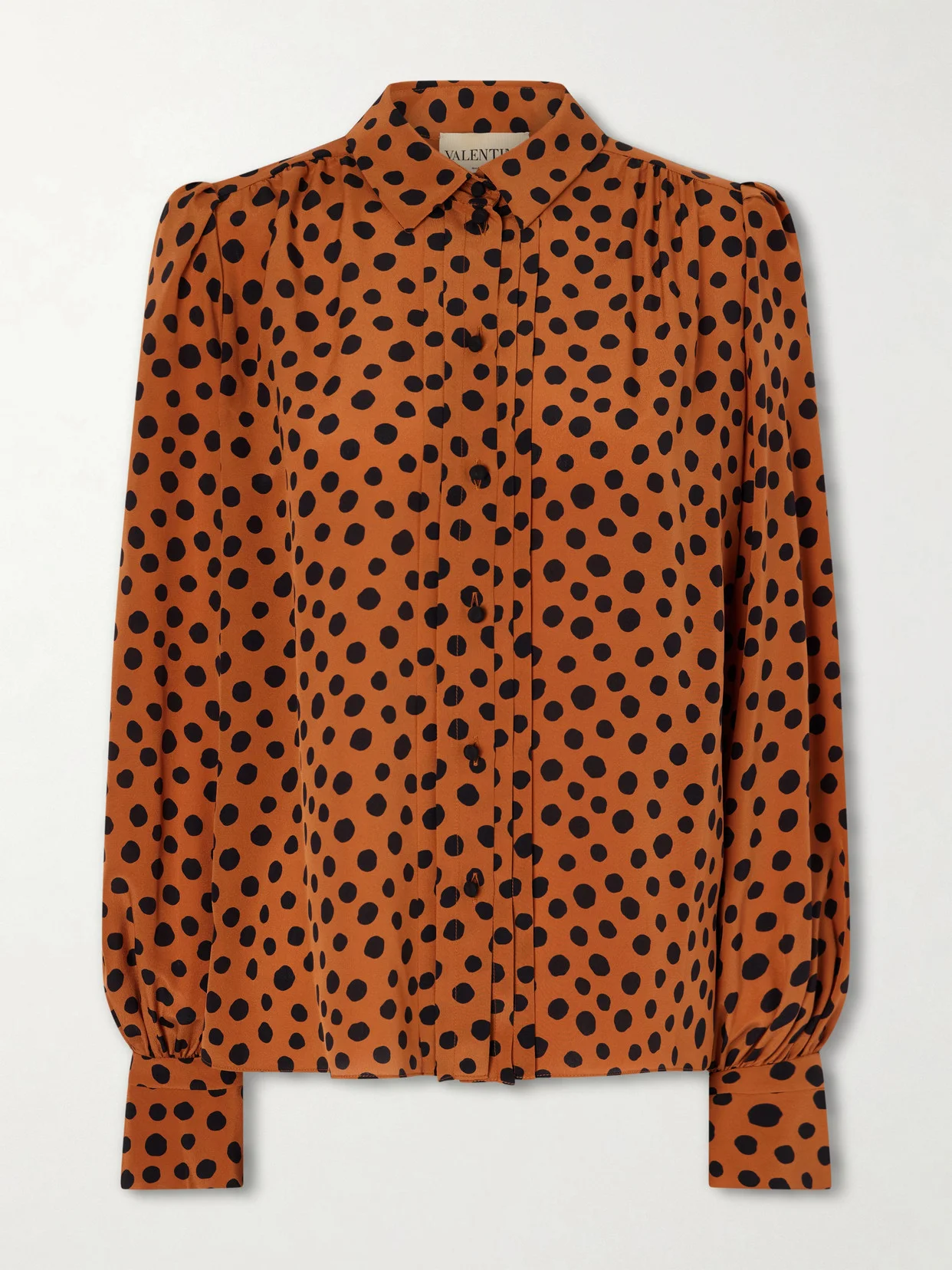Valentino Garavani's romantic craftsmanship is evident in this delicately printed shirt. Cut from fluid silk crepe de chine, it features a Dalmatian-inspired polka-dot motif and soft gathers at the front. Style it with jeans or a pencil skirt, depending on the occasion.