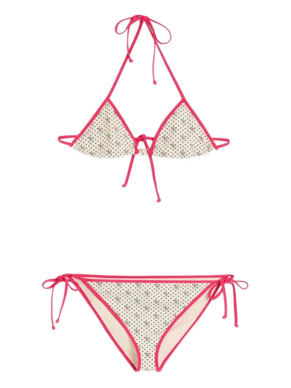 Gelatini-print bikini Highlights - Off white - Halterneck tie fastening - Rear tie fastening - Triangle cup - Side tie fastening - Polka dot print - V-logo signature detail - Be mindful to try on swimwear over your own garments. Made in Italy Composition Polyamide 71%, Elastane 29% Washing instructions Read Manufacturer Guidelines
